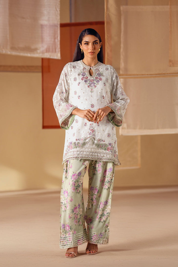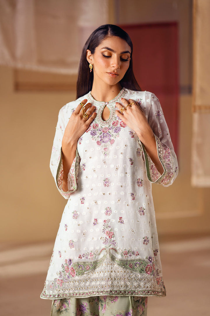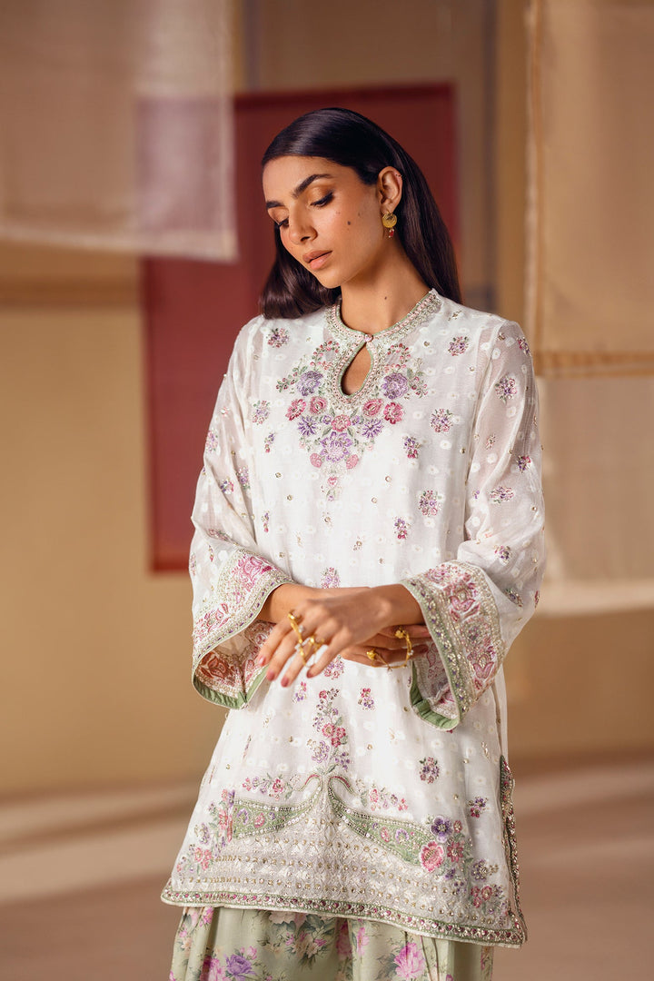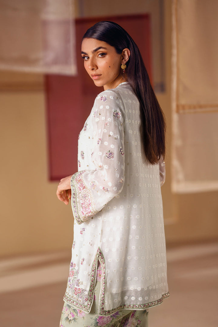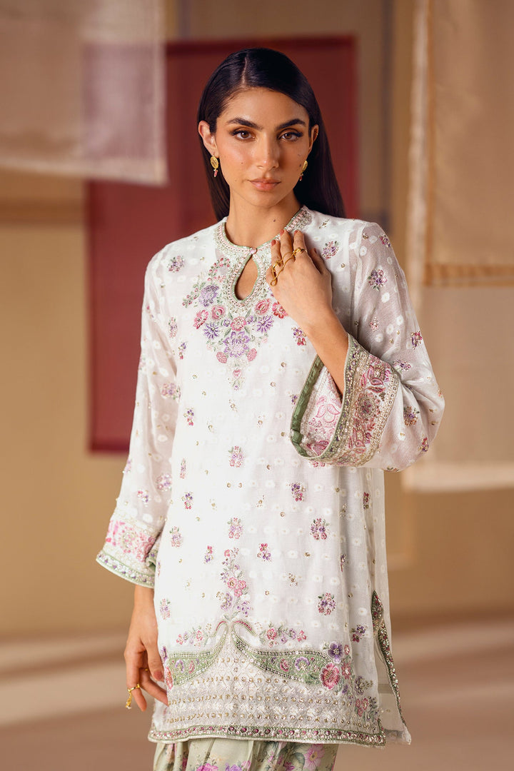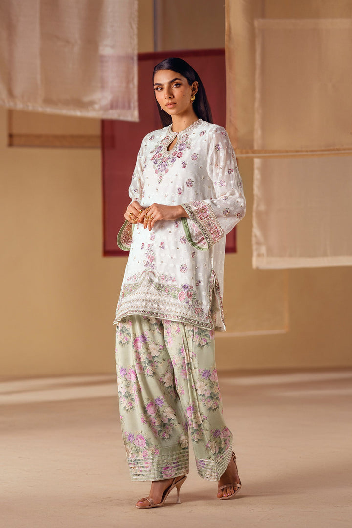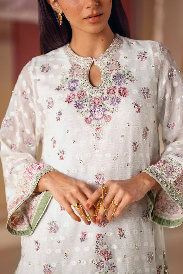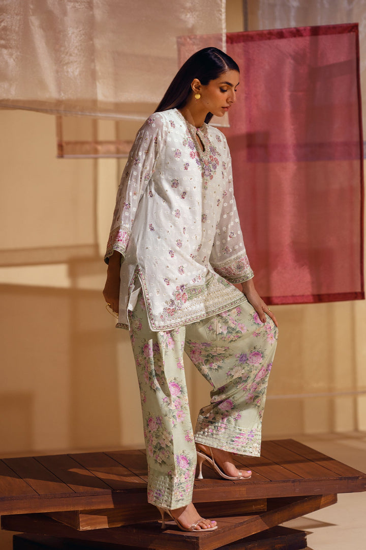 A vision of delicate elegance and artistic charm. This 3-piece suit includes a beautiful off-white shirt with intricate floral embroidery in soft pink and green hues. The look is completed with an inner slip and a farshi shalwar in a serene sage green, adorned with a graceful floral print and a stunning embroidered border. This ensemble is a perfect blend of timeless romance and modern style.