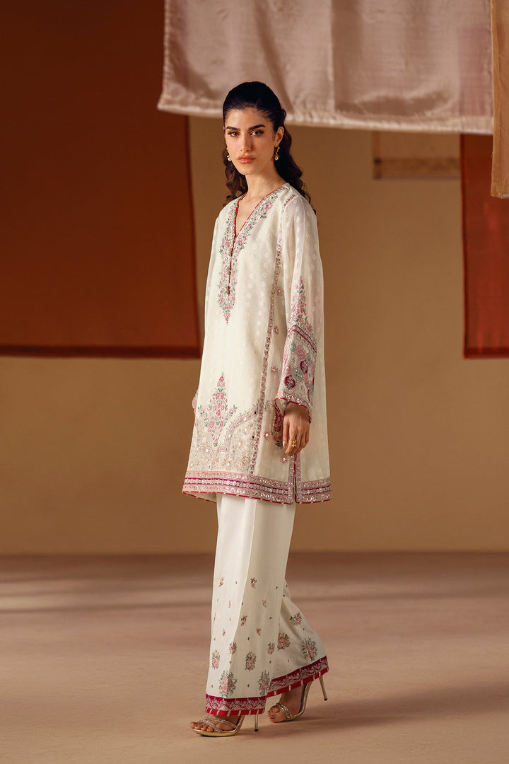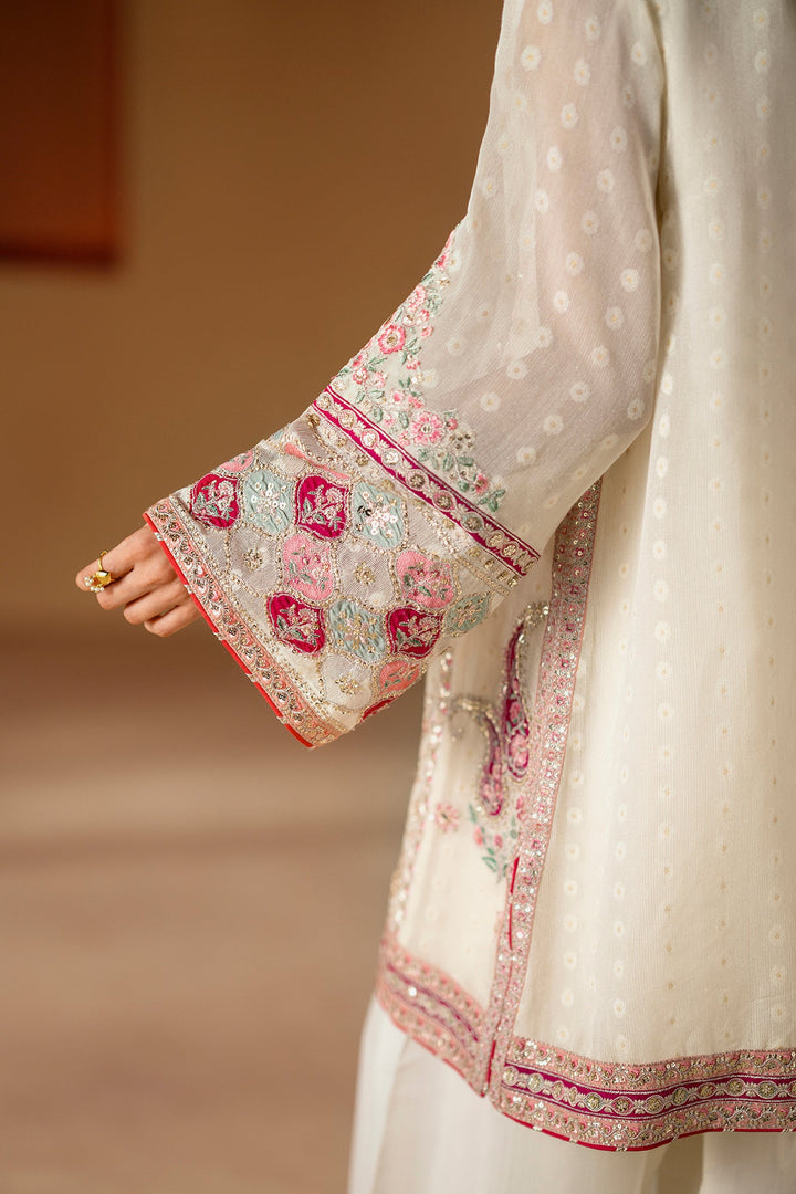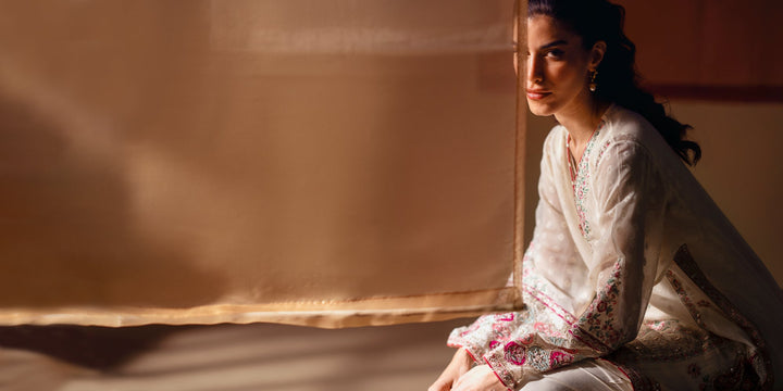 A masterpiece of sophisticated artistry. This stunning 3-piece suit includes an A- line shirt, a shalwar, and a separate inner slip. The shirt, in a soft cream hue, is beautifully adorned with intricate floral embroidery in vibrant shades of pink and green. The farshi shalwar features a matching embroidered border, creating a cohesive and elegant look. This ensemble is a celebration of rich color and captivating craftsmanship, perfect for making a memorable statement.