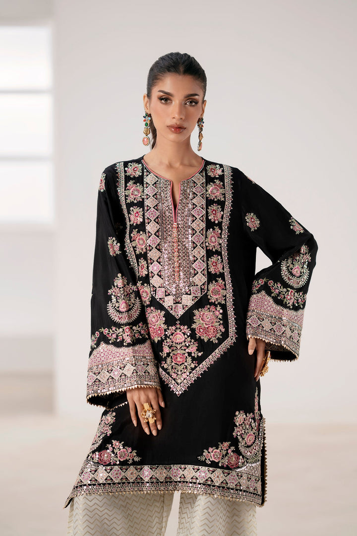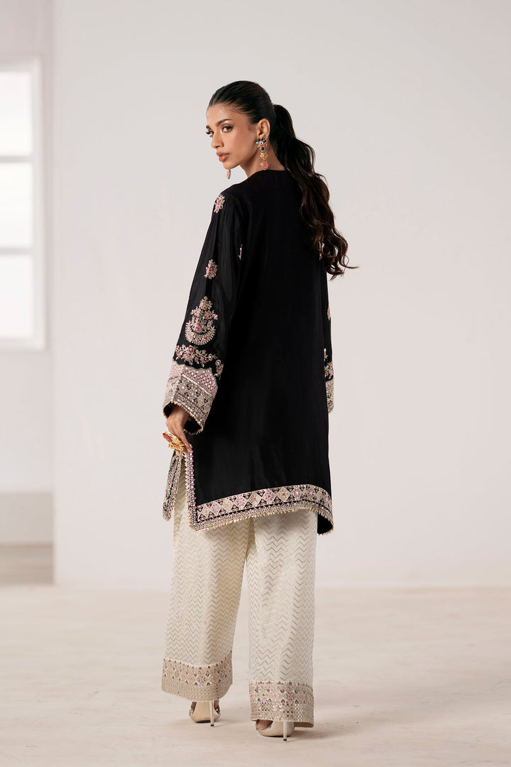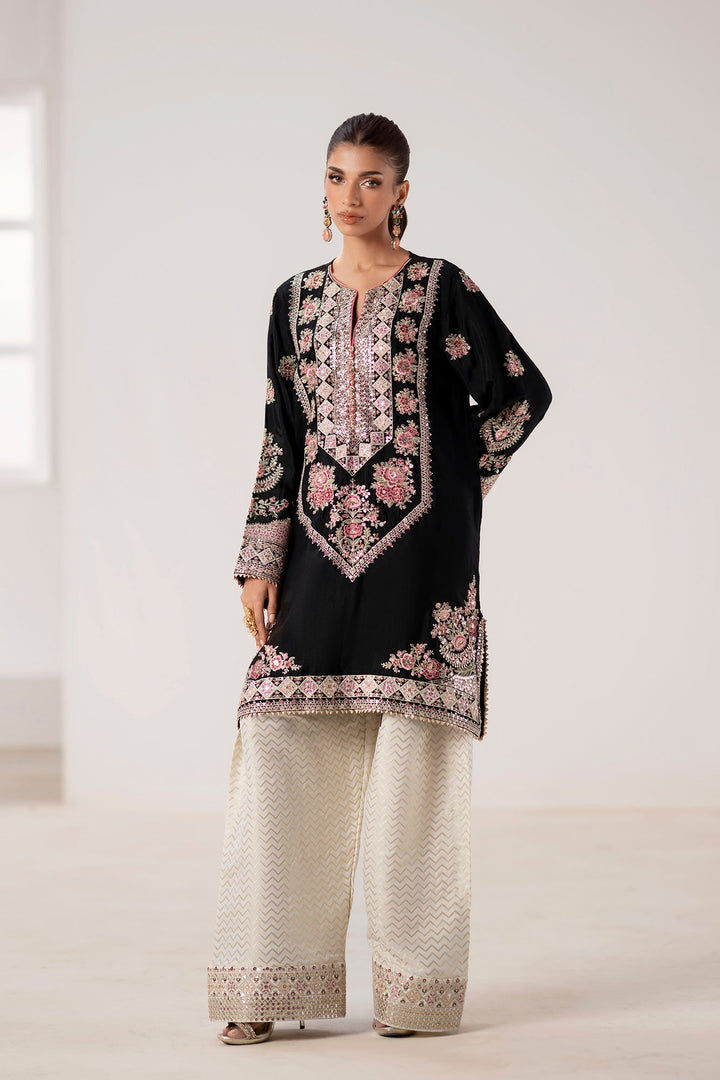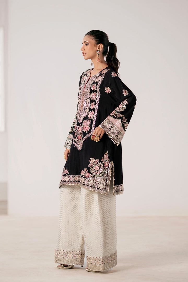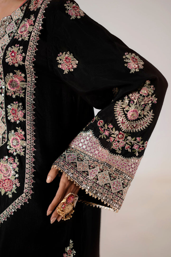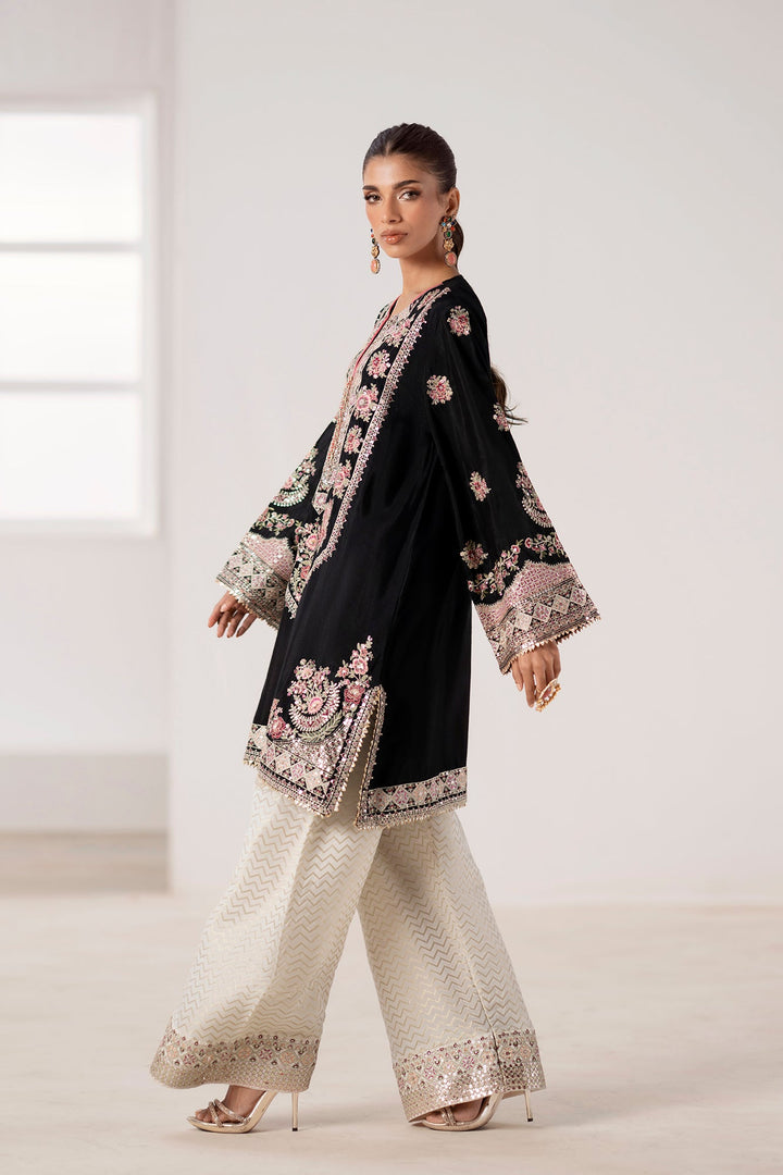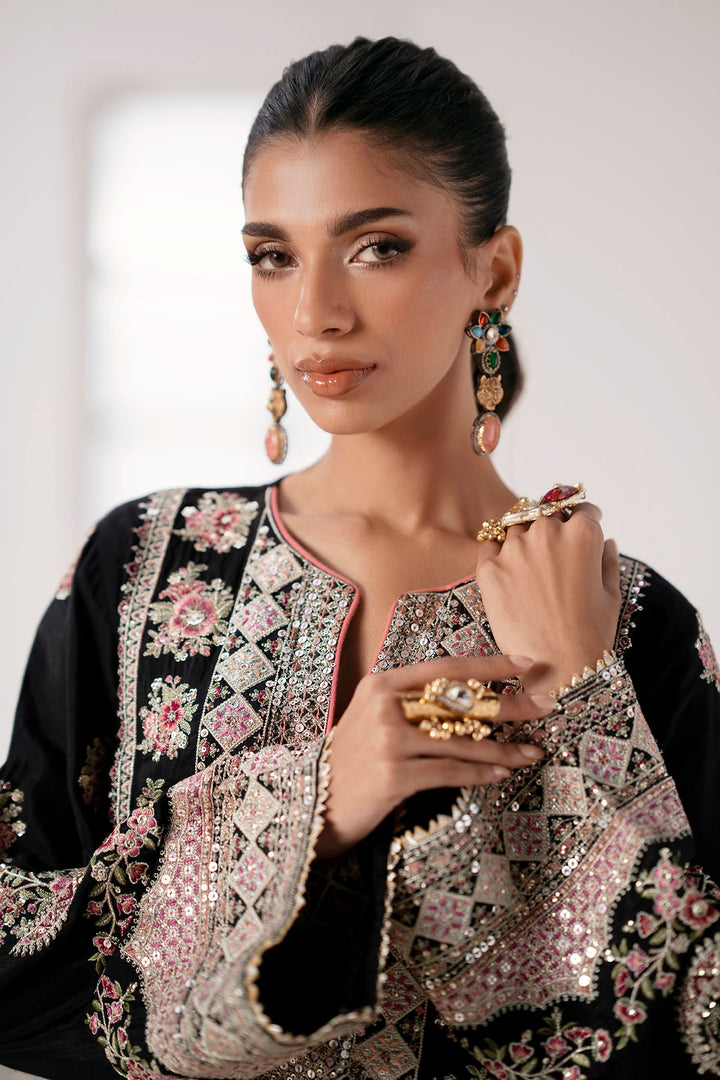 Immerse yourself in regal sophistication with this exquisite embroidered suit. The black shirt is a canvas for intricate, multi-colored embroidery in shades of pink, gold, and green. A heavily detailed placket and border, along with elaborate motifs on the sleeves, create a stunning visual. The ensemble is completed with wide-leg shalwar in a luminous, off-white fabric featuring a sophisticated geometric pattern and a delicately embellished border. This suit is the perfect blend of traditional artistry and modern elegance, designed to make a memorable statement.
