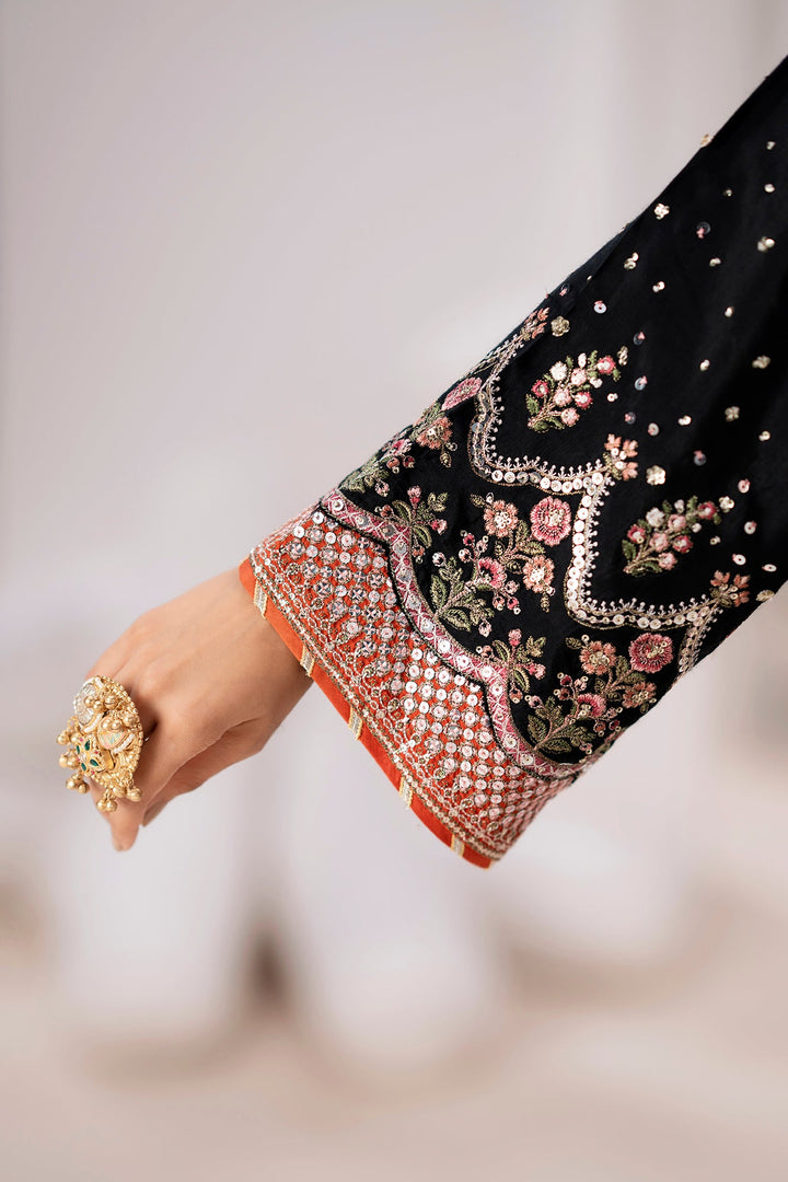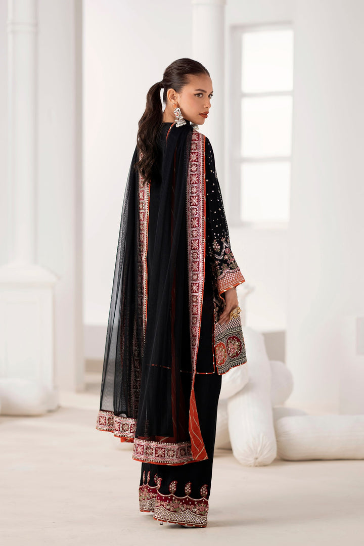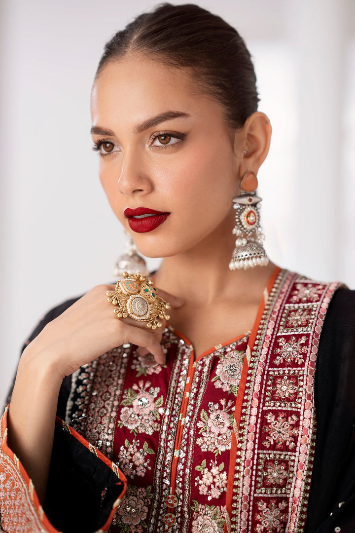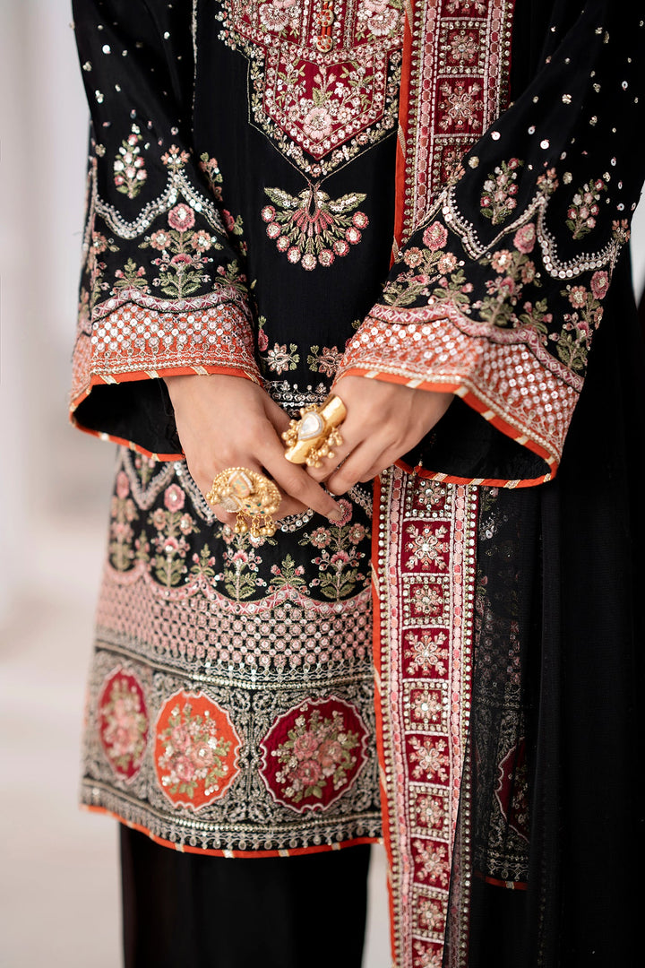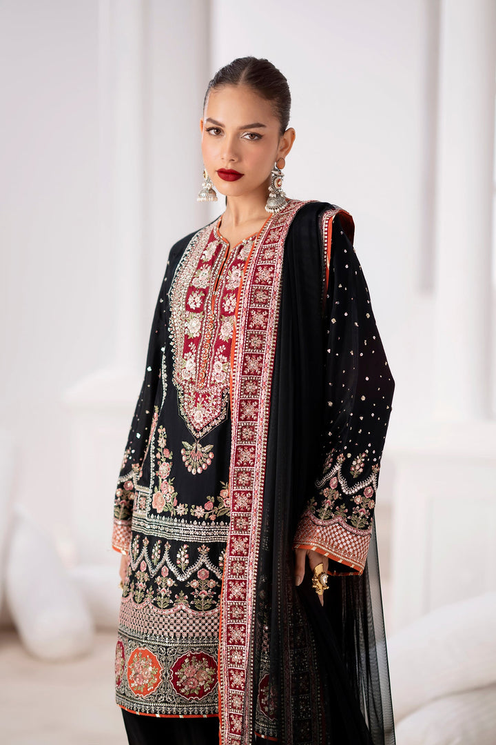 Envelop yourself in this breathtaking embroidered suit, a masterpiece of rich detail and traditional artistry. The black shirt is heavily embellished with intricate embroidery in deep crimson, gold, and green, creating a stunning visual feast. The elaborate patterns cover the neckline, sleeves, and hemline, reflecting a fusion of traditional motifs and contemporary style. The ensemble is completed with straight shalwar and a delicate, coordinating black dupatta with an embroidered border. This suit is designed for grand occasions, ensuring you make a statement of sophisticated elegance.