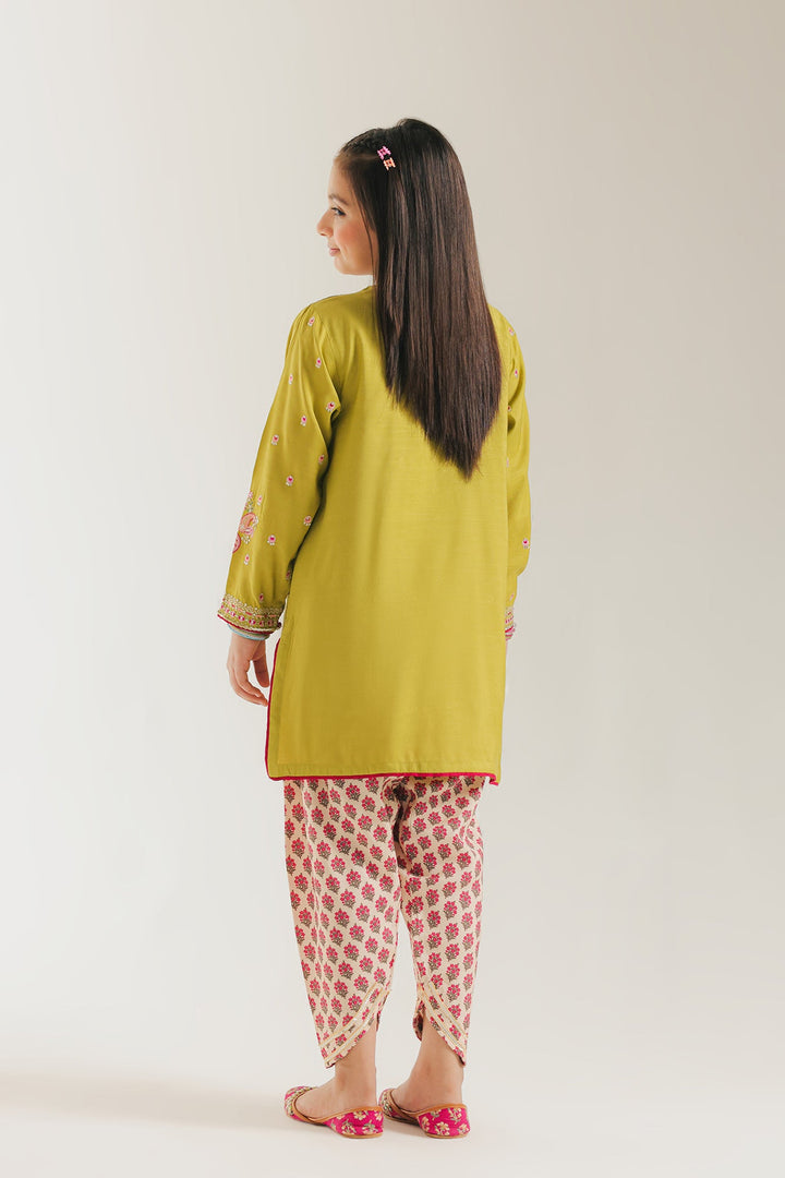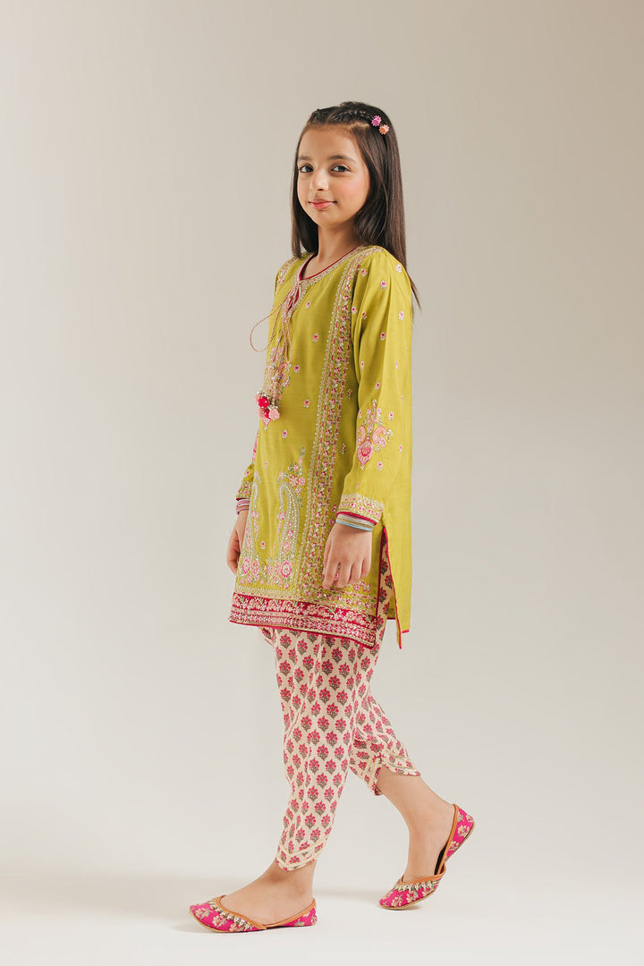 Illuminate the room with this gorgeous lime-green embroidered suit. The short, festive kurta is crafted from a bright, fresh lime-green fabric. It is richly embellished with elaborate thread and sequin embroidery in pink and gold tones, featuring a dense paisley and floral design across the yoke, sleeves, and hem. The V-slit neckline is accented with colorful tassels detail. The ensemble is perfectly complemented by shalwar. The shalwar feature an all-over, small-scale floral print in shades of cream and pink, creating a playful and festive contrast. This suit is an eye-catching choice for any special occasion.