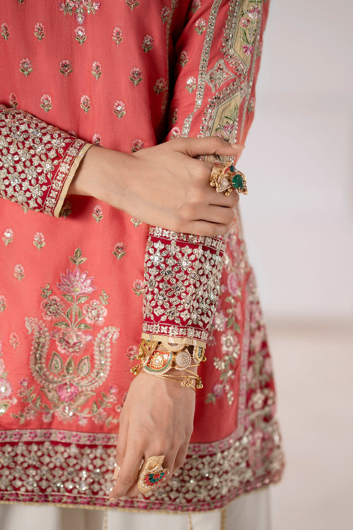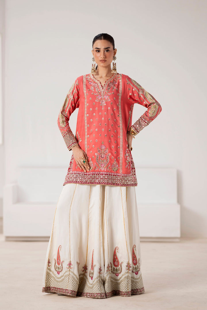 Emerge in festive splendor with this exquisite embroidered suit. The vibrant coral shirt is a canvas for intricate embroidery, featuring delicate floral and vine patterns in shimmering gold, silver, and soft pink. A beautifully detailed neckline and embellished sleeves add a touch of traditional elegance. The ensemble is completed with a stunning, wide-legged sharara in a crisp off-white. The sharara is a masterpiece in its own right, adorned with a bold, contrasting embroidered paisley border that elevates the entire look. This suit is the perfect choice for a grand celebration, blending festive colors with refined craftsmanship.