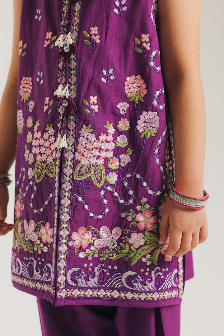 This enchanting suit is a celebration of vibrant color and beautiful detail. The rich purple tunic is a perfect backdrop for the stunning, multi-colored floral embroidery that cascades down the front. The intricate pink, white, and green patterns, along with delicate tasseled accents, give the sleeveless shirt a whimsical and elegant feel. The outfit is completed with matching purple shalwar that have a coordinated embroidered border at the hem. This lovely ensemble is a perfect choice for a young girl to wear to a special occasion or a festive gathering.