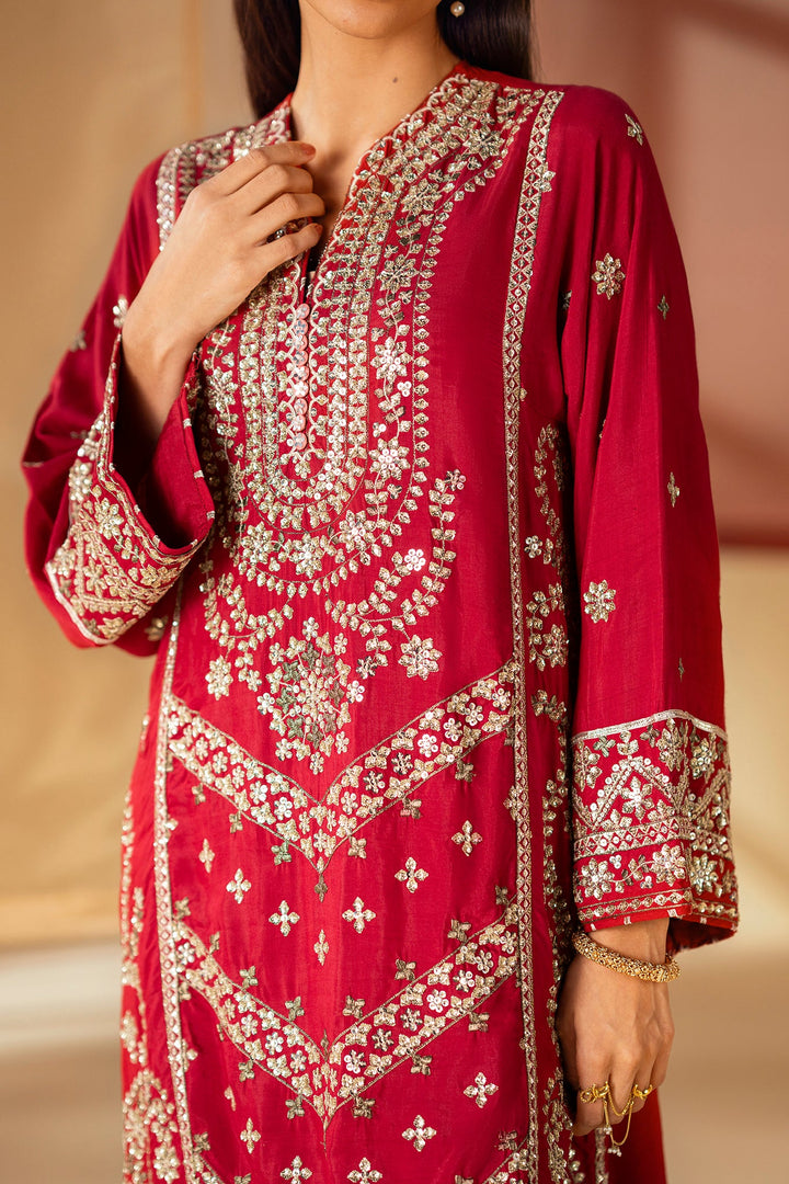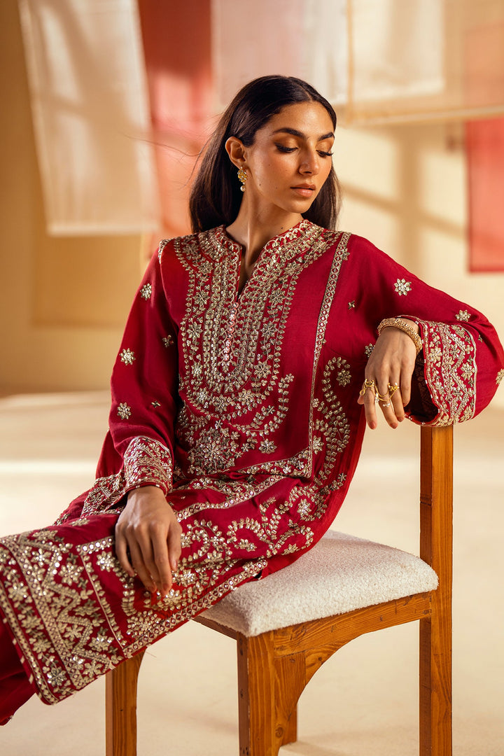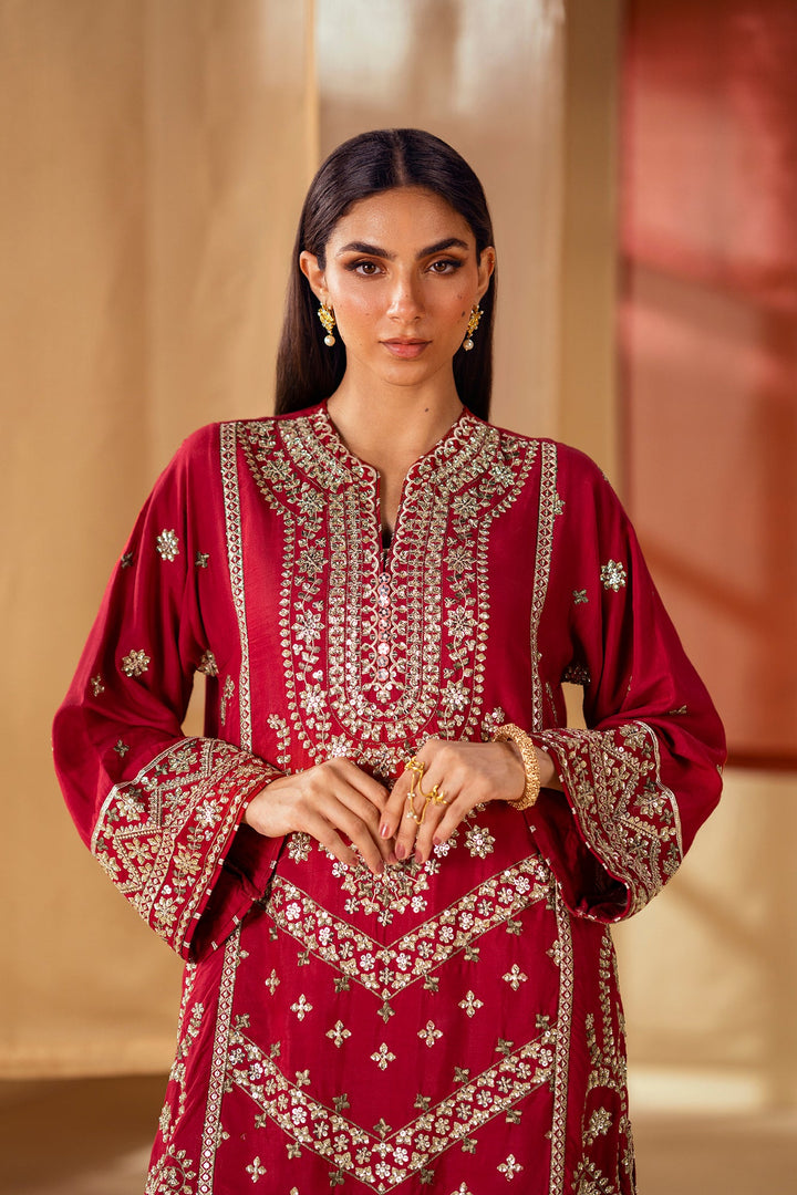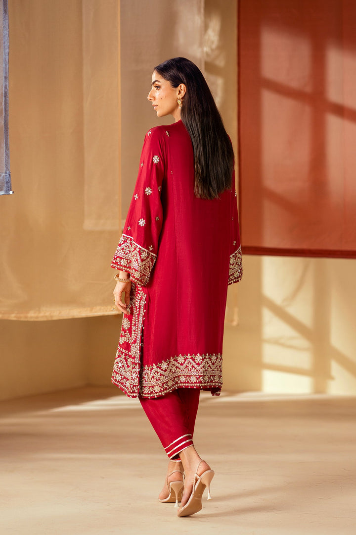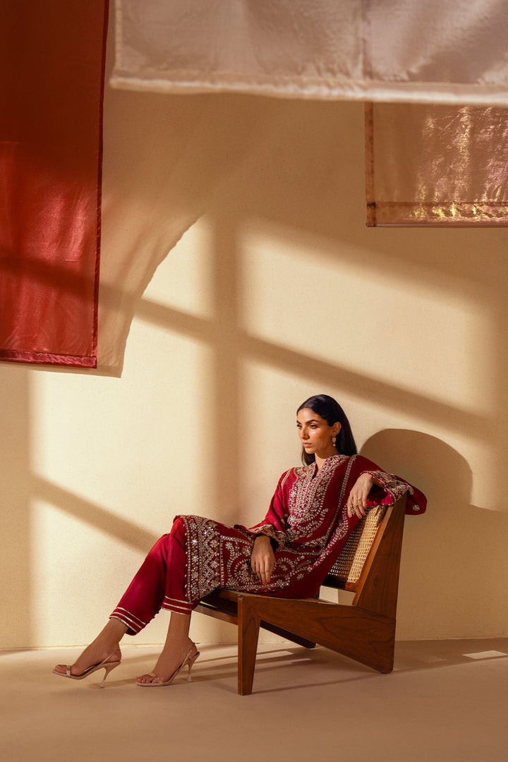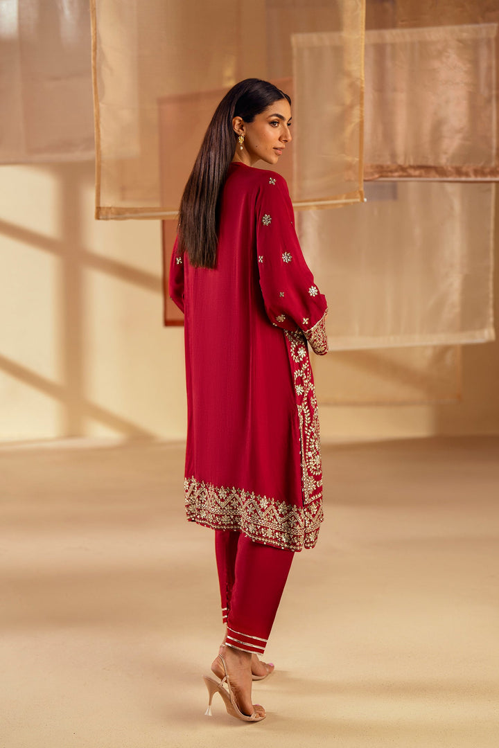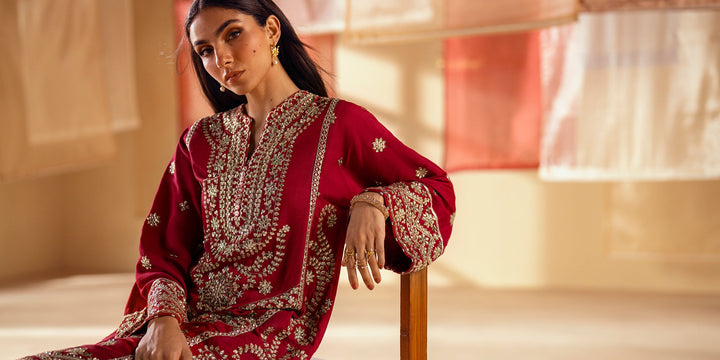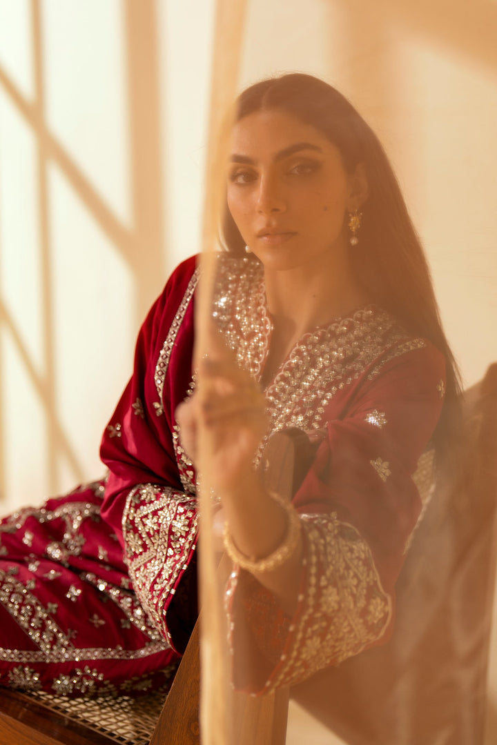 Drenched in a deep, captivating hue, this stunning embroidered suit is a vision of regal sophistication. The rich maroon fabric serves as a beautiful canvas for intricate silver and gold embroidery that adorns the front of the shirt and the borders of the sleeves. The tapered-fit shalwar feature a matching border with button addons, creating a cohesive and elegant look. This ensemble is a celebration of luxurious color and timeless artistry, perfect for making a grand statement.
