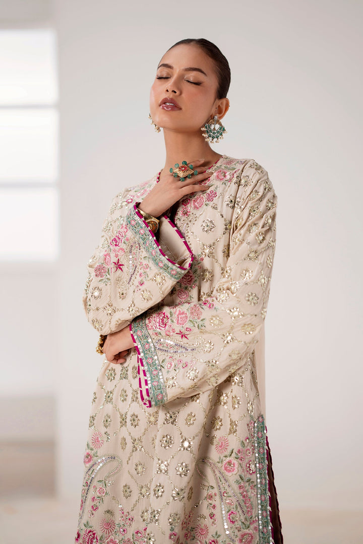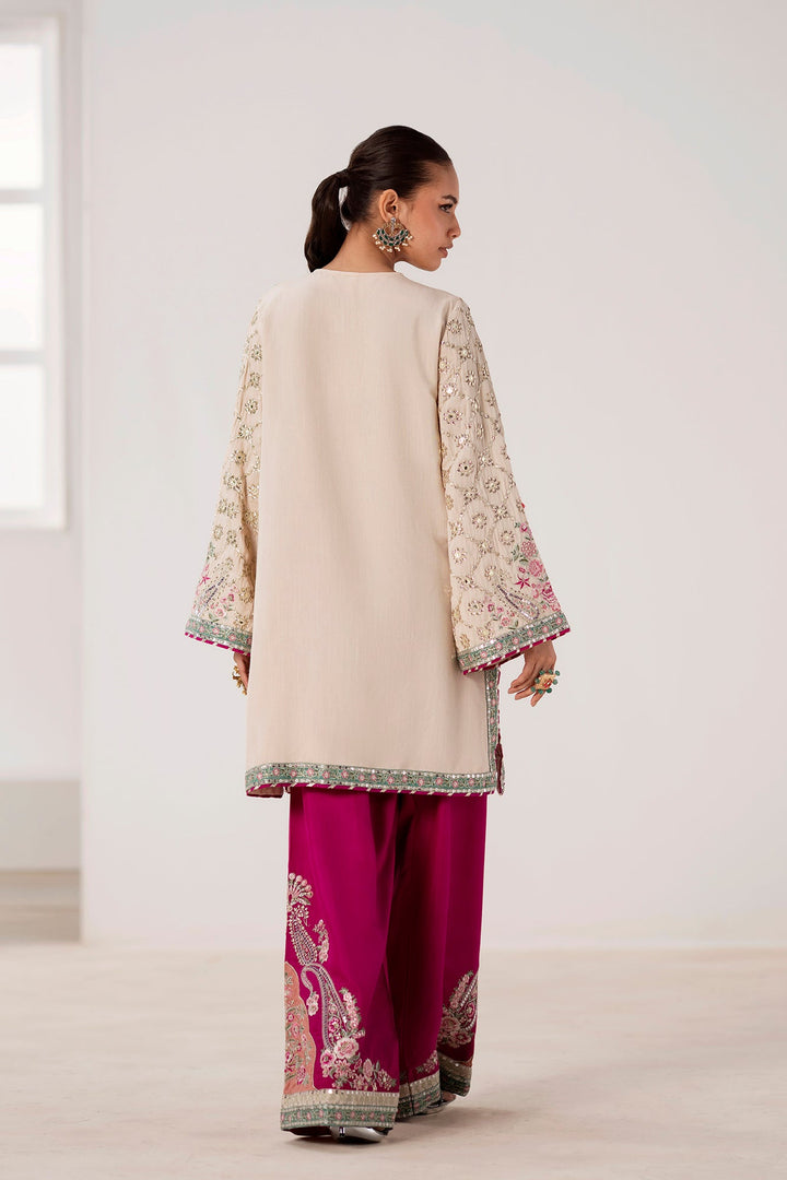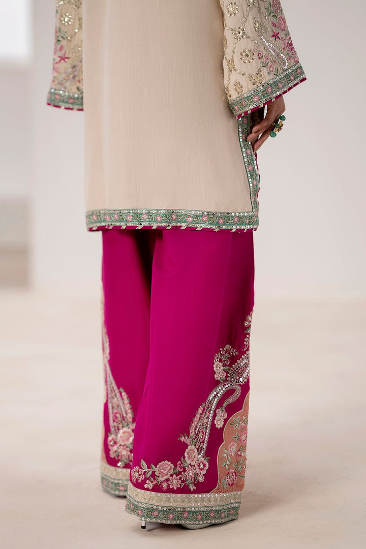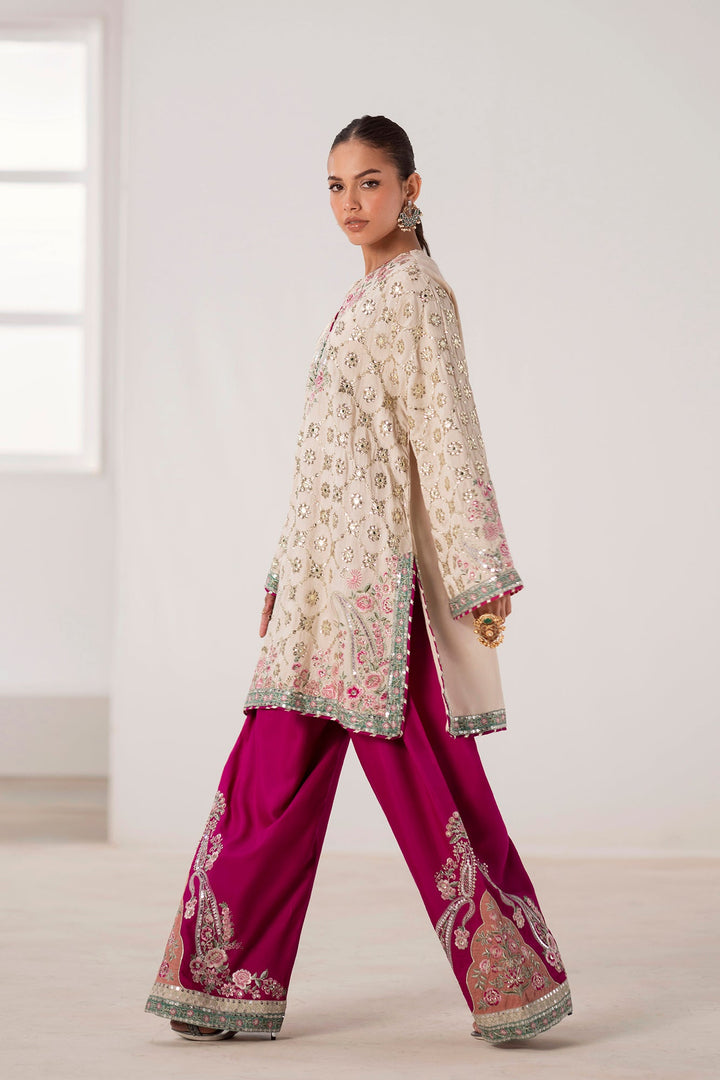 Immerse yourself in festive elegance with this stunning embroidered suit. The off-white shirt is a masterpiece of design, with intricate embroidery in shades of soft pink and green, enhanced with shimmering silver sequins. A delicately embellished neckline adds to its luxurious feel. The ensemble is completed with wide-leg shalwar in a vibrant fuchsia, adorned with a bold, embroidered paisley and floral border in complementary tones. This suit is the perfect choice for making a glamorous and memorable statement at any celebration.