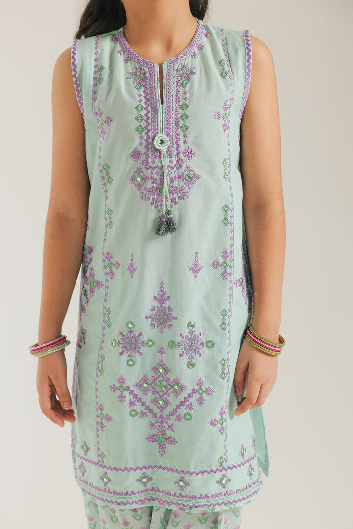 This delightful embroidered suit is a charming and fresh addition to her collection. The sleeveless mint green kurta is beautifully adorned with intricate purple embroidery that features delicate patterns and shimmering accents. It is perfectly paired with a coordinating shalwar that has a lovely all-over print, creating a harmonious and polished look. This suit is an enchanting choice for any special occasion.