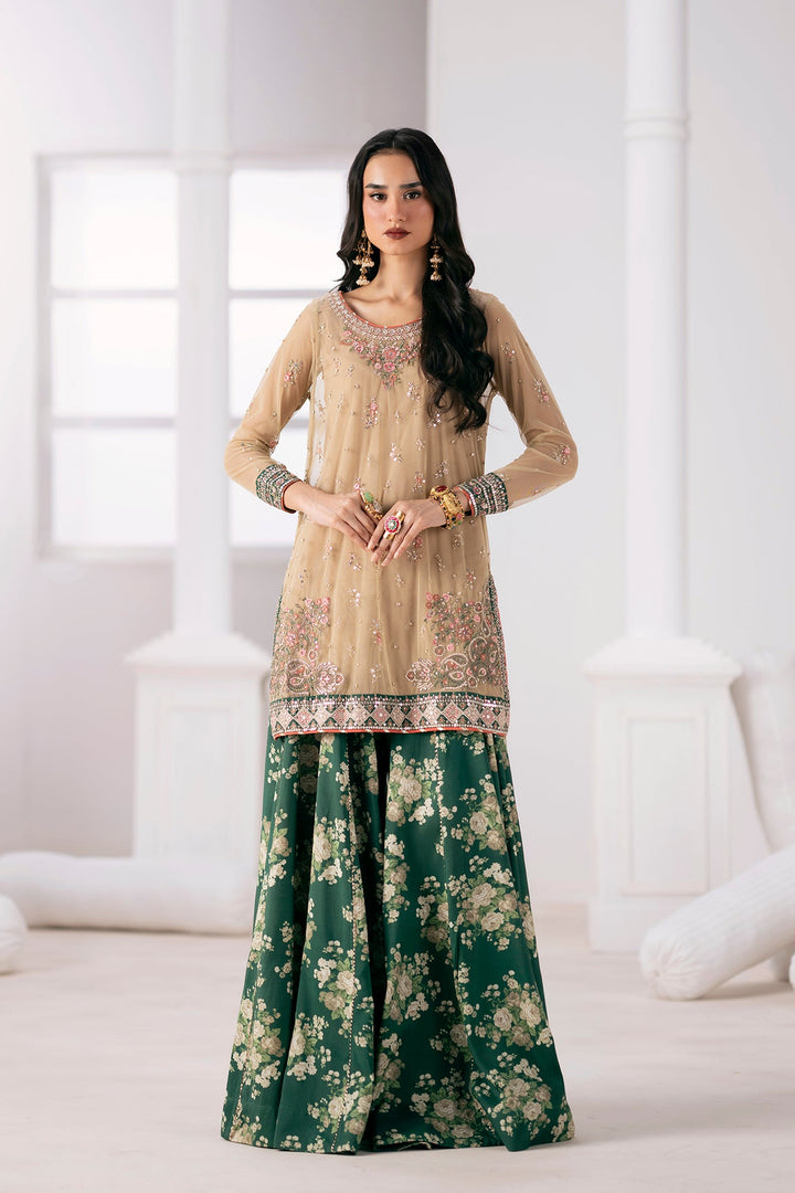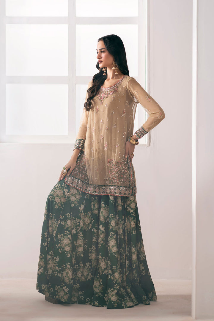 Drape yourself in this enchanting embroidered suit, a perfect blend of delicate artistry and elegant design. The shirt is crafted from a soft, sheer organza in a warm beige, beautifully embellished with intricate floral embroidery in shades of pink and green, and accented with shimmering sequins. The rich embroidery on the neckline, cuffs, and hemline adds a touch of sophisticated glamour. The ensemble is completed with a full, flowing sharara in a deep forest green, adorned with a graceful all-over floral print. This suit is an ideal choice for a grand celebration, offering a look that is both festive and refined.