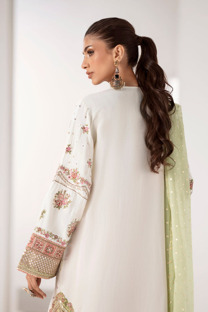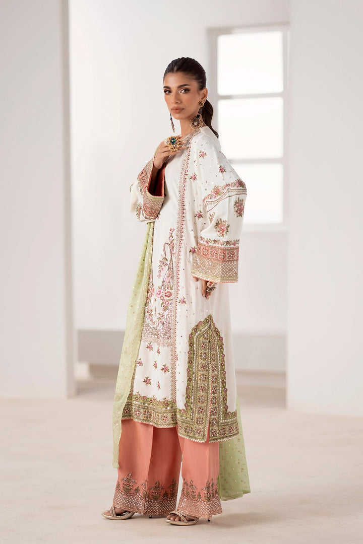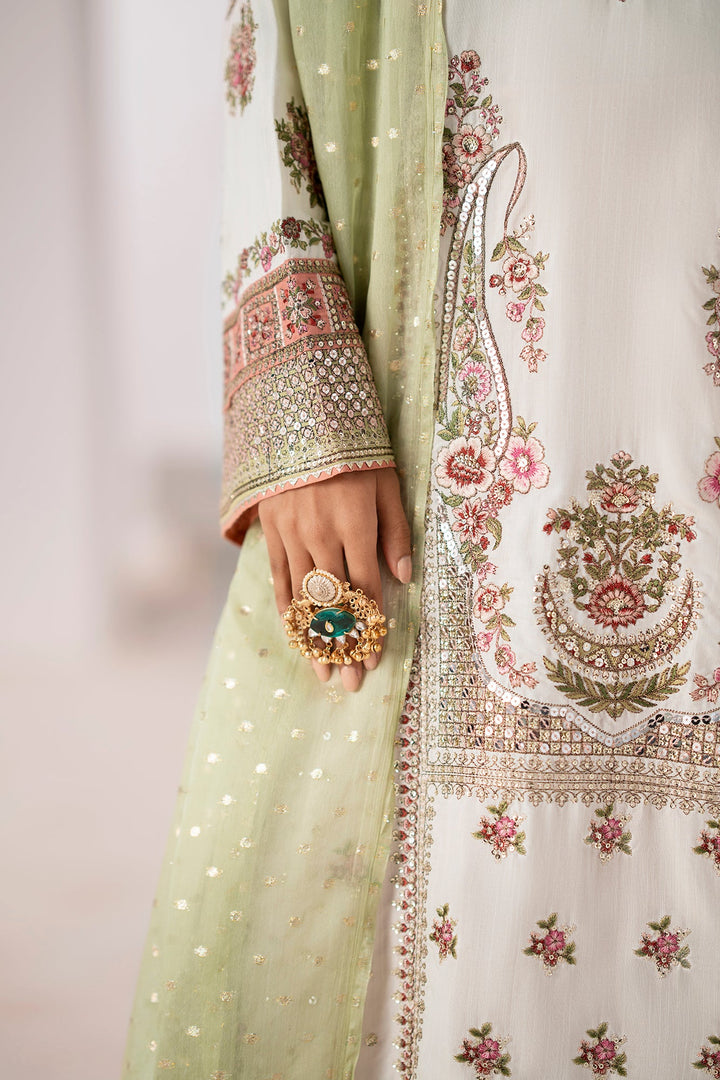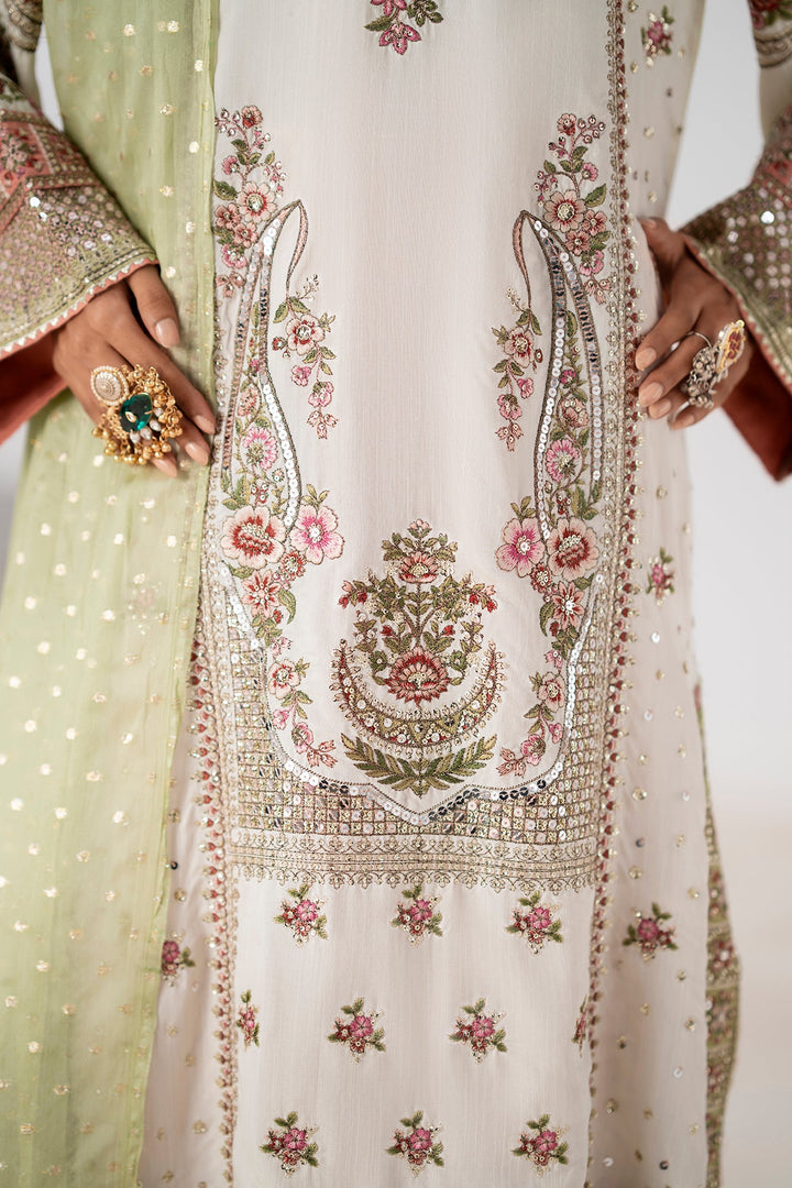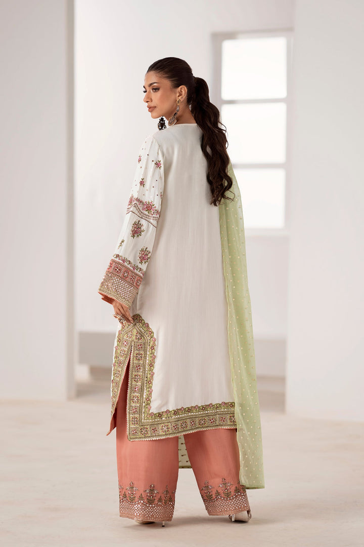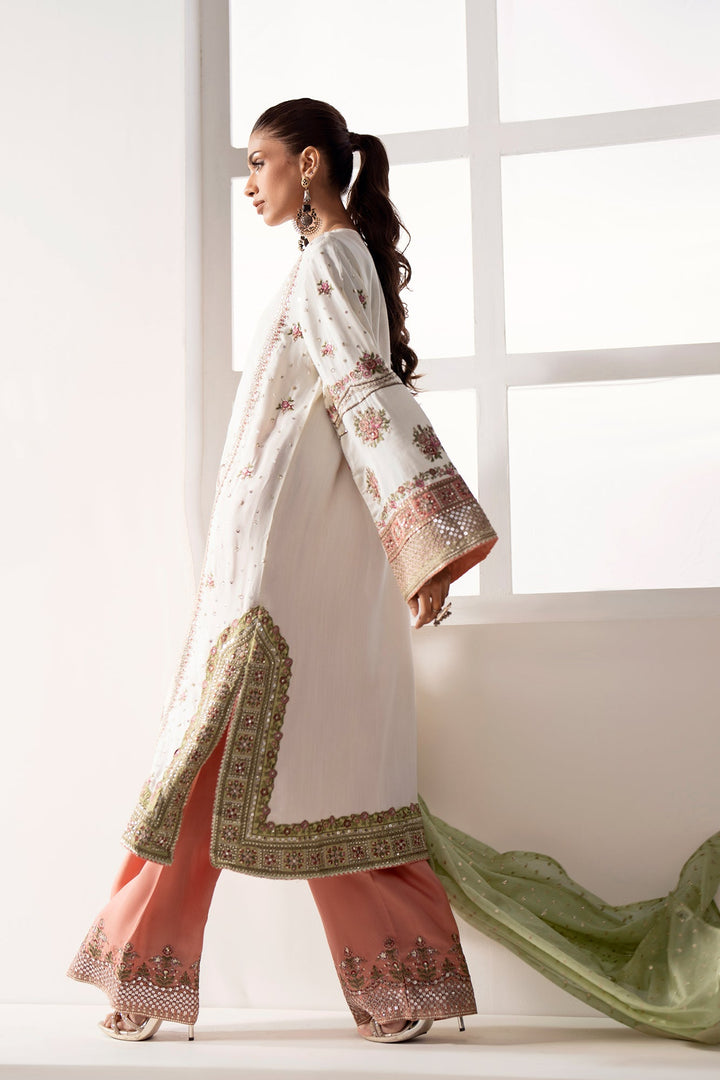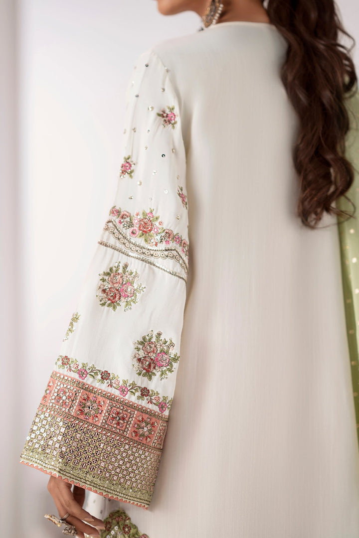 Immerse yourself in understated elegance with this exquisite embroidered suit. The off-white shirt is a masterpiece of design, with intricate embroidery in soft shades of pink, green, and gold, featuring elegant paisley and floral motifs. The wide, full-length sleeves are adorned with a beautiful embroidered border in terracotta, adding a rich contrast. The ensemble is completed with straight trouser in a lovely blush pink, featuring a shimmering, heavily embellished border. A delicate, soft green organza dupatta with subtle sequin work adds a final touch of grace. This suit is the perfect choice for making a sophisticated and memorable statement at any special occasion.
