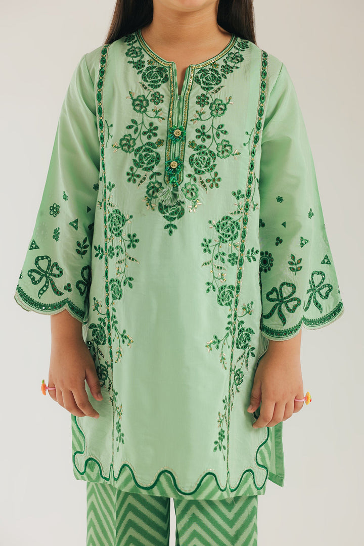 Bring a fresh pop of color to her wardrobe with this adorable embroidered suit. The mint green shirt features a beautiful display of delicate floral and vine embroidery in darker shades of green, with intricate detailing along the front placket, hemline, and sleeves. The shirt's scalloped embroidery along the hem and full sleeves add to its playful charm. The ensemble is completed with straight trousers that feature a fun and modern chevron print, making this outfit a stylish choice for any young fashionista.