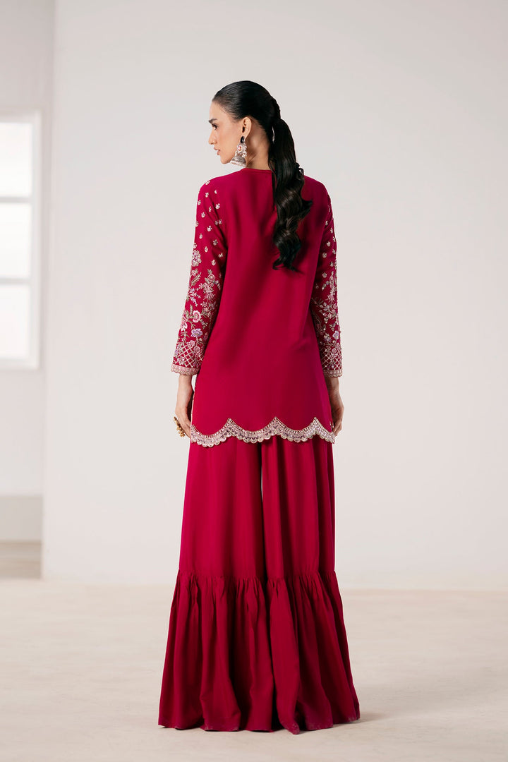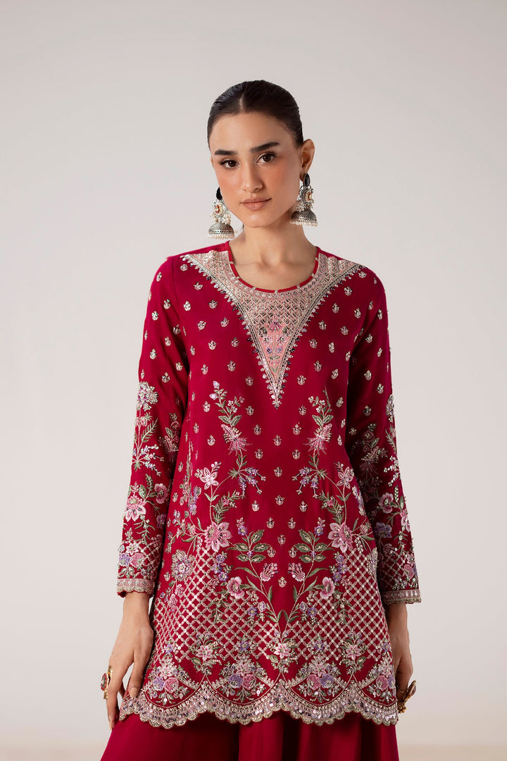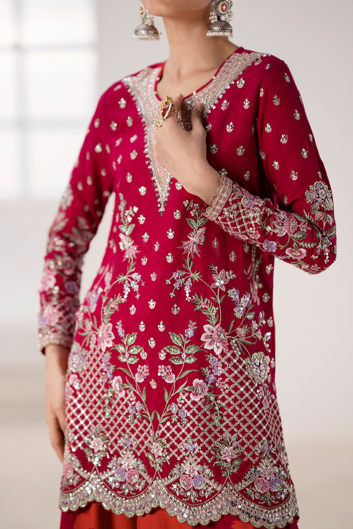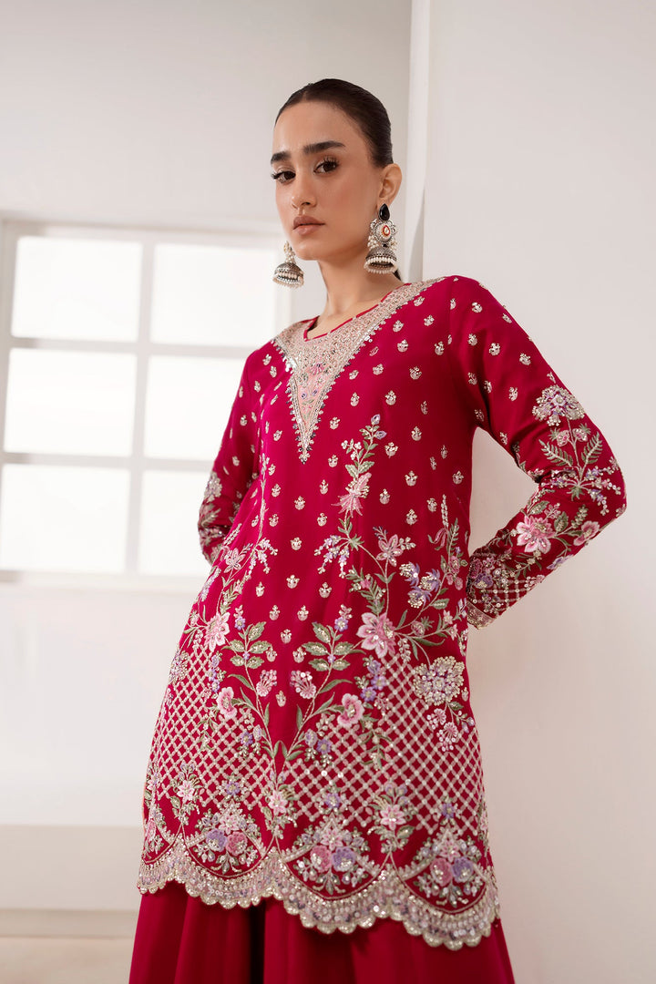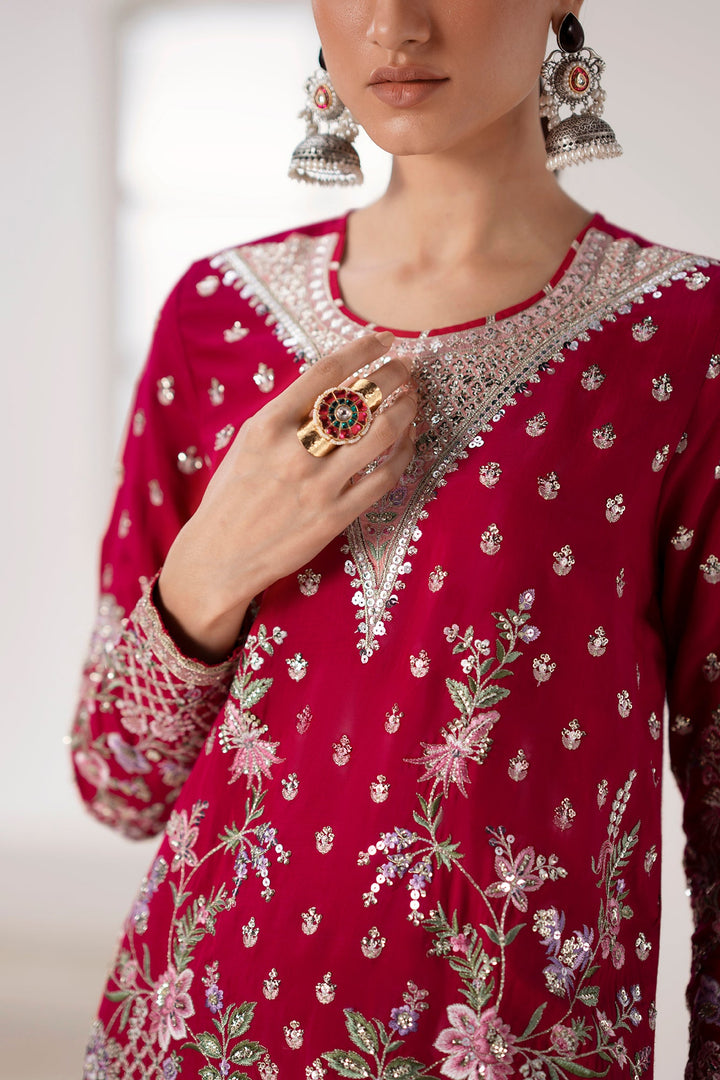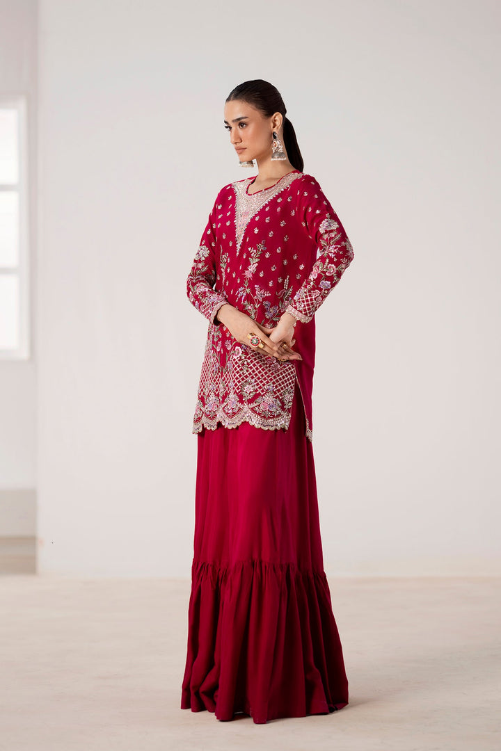 Command attention in this breathtaking embroidered suit, a perfect blend of festive color and refined craftsmanship. The vibrant ruby shirt is a canvas for intricate embroidery in shimmering silver, gold, and delicate pink, creating a stunning and sophisticated pattern. The heavily detailed neckline and border, along with the embellished sleeves, add a touch of regal elegance. The ensemble is completed with a full, flowing gharara in a matching ruby hue, featuring a pleated hem that adds movement and grace. This suit is the perfect choice for a grand celebration, ensuring you make a memorable statement of timeless style.