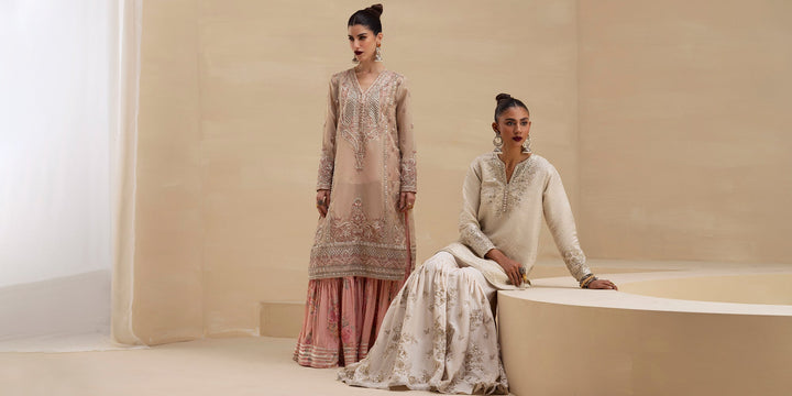 Illuminate the evening in this exquisitely detailed ivory embroidered suit, featuring a short shirt and a magnificent gharara. The straight-cut shirt is crafted from a luxurious off-white fabric with a subtle tonal woven pattern and features a deeply flattering V-neckline. The bodice and full sleeves are richly embellished with intricate gold and silver embroidery and sequin-work, giving it a luminous, festive appeal. The ensemble is completed by a voluminous gharara in a coordinating cream beige hue. The lower tier of the gharara is adorned with delicate, ornate gold thread embroidery and sequin work, creating a majestic, flared silhouette that is ideal for formal weddings or celebratory occasions.