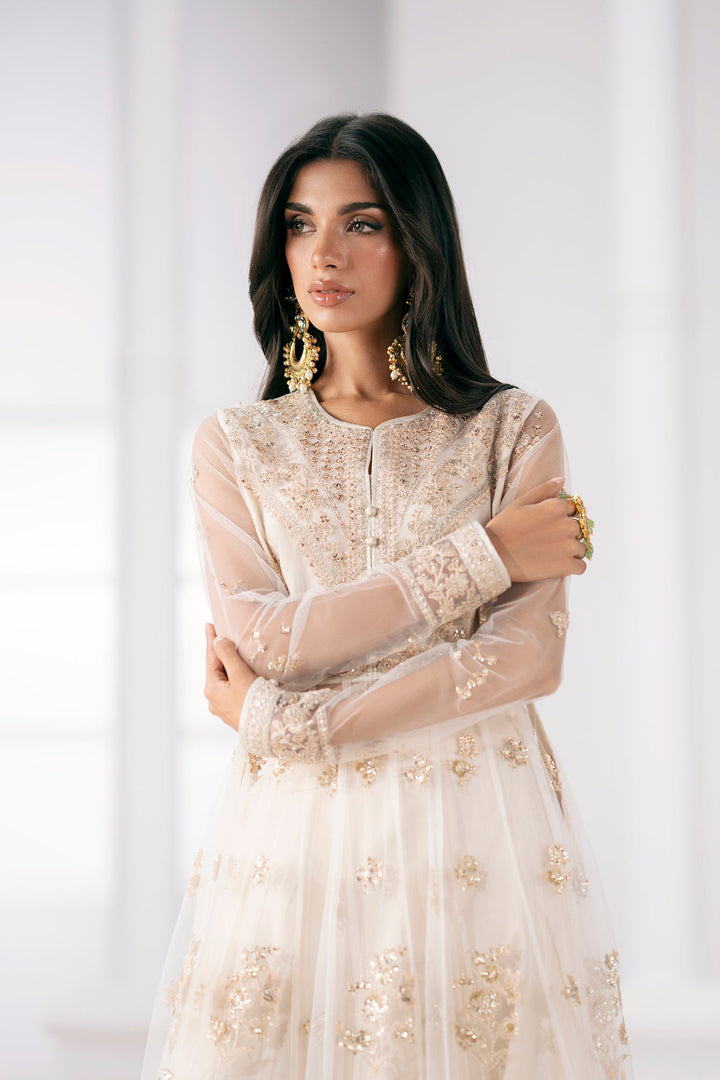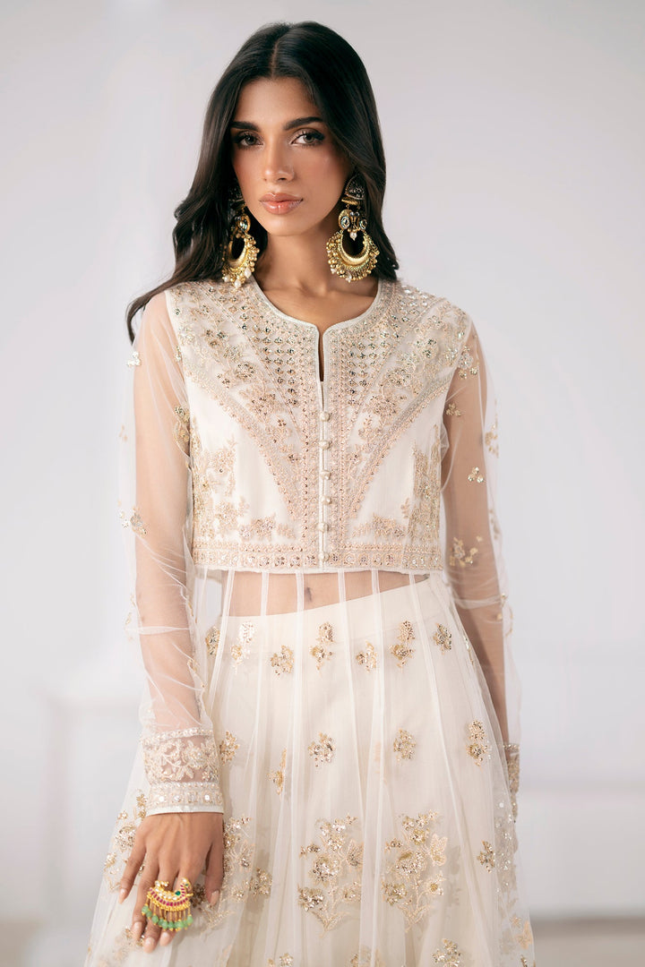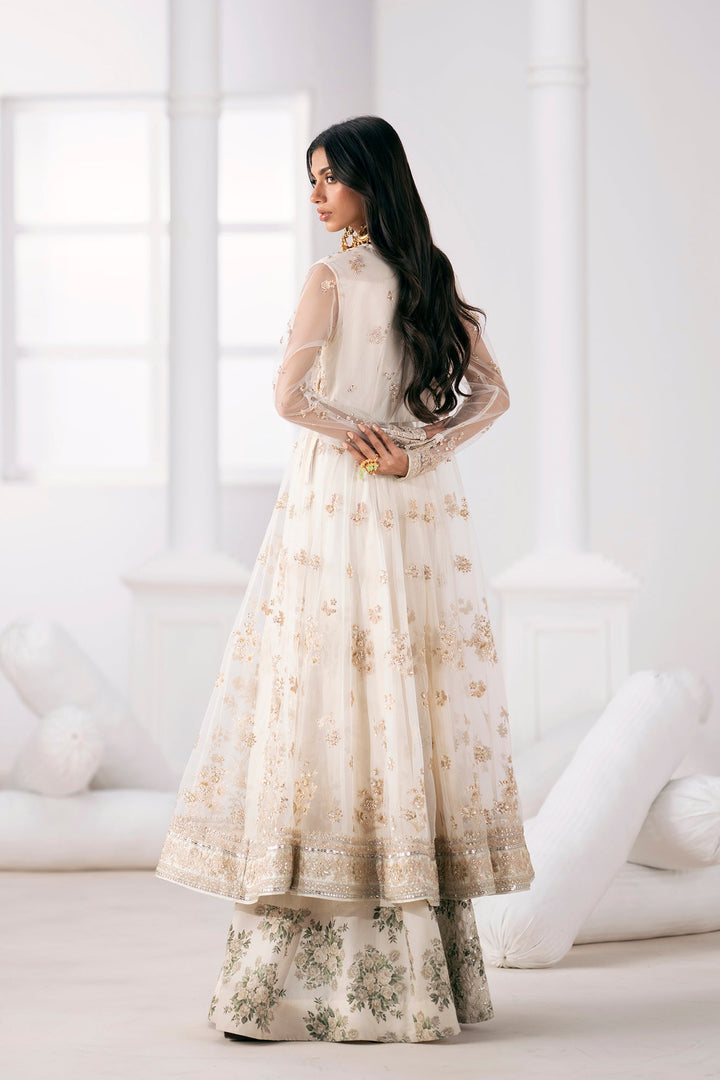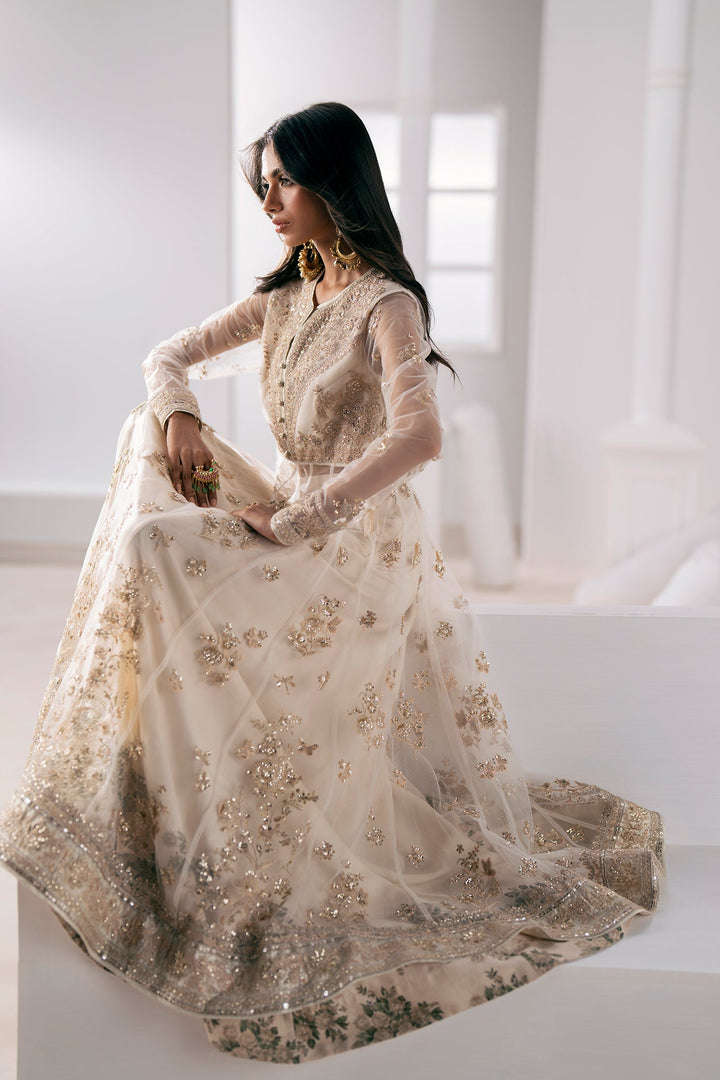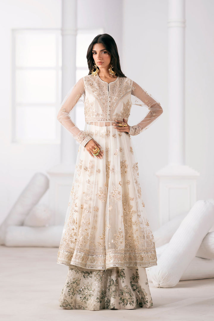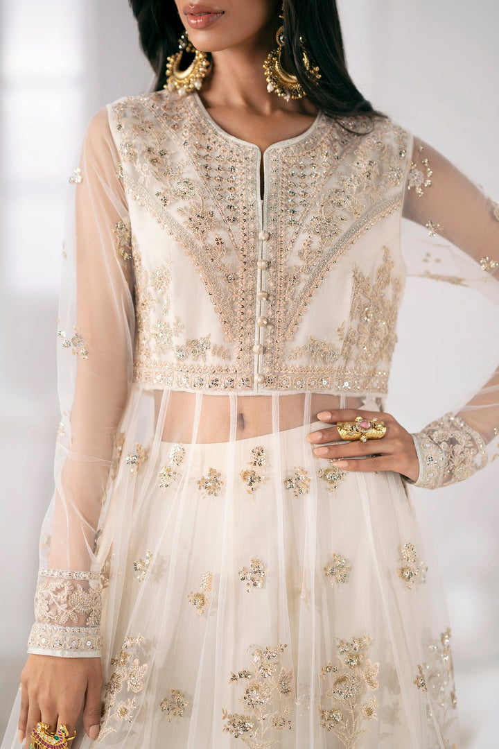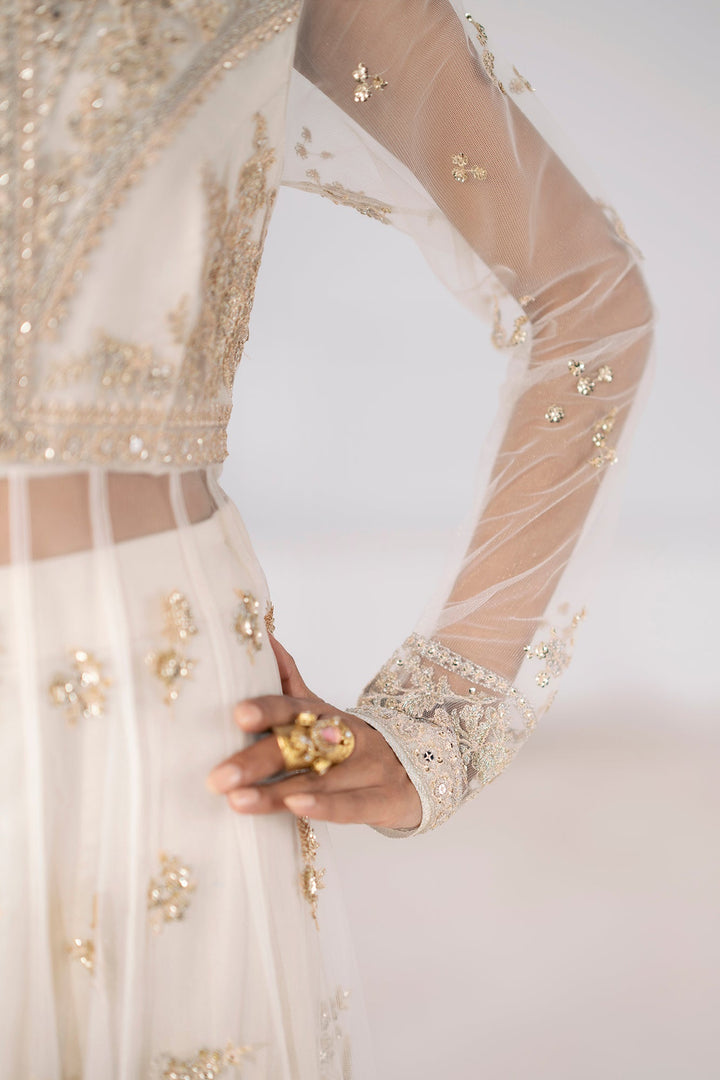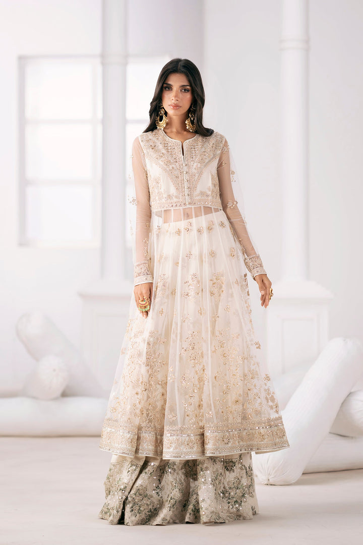 Wrap yourself in this breathtaking embroidered suit, a masterpiece of elegance and luxury. The sheer, long pishwas in a soft off-white is a canvas for stunning gold embroidery and shimmering sequin work, creating a dazzling display. The intricate patterns cascade down the shirt, with a heavily embellished bodice that adds to its regal charm. The ensemble is layered over a graceful lehenga, also in off-white, with delicate floral embroidery that peeks out from beneath the shirt. This magnificent suit is the perfect choice for a grand celebration, ensuring a look that is both timeless and unforgettable.