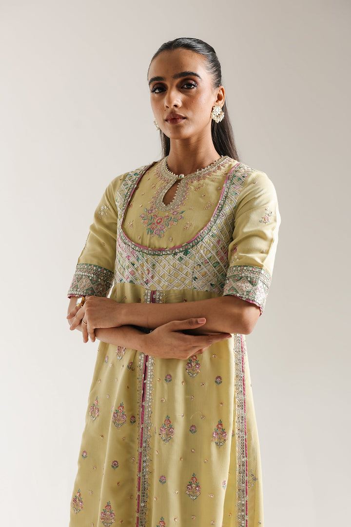 Envelop yourself in this ethereal yellow embroidered suit. The long, flowing open-front shirt is crafted from a delicate fabric and features intricate pink, green, and silver thread embroidery and subtle sequin work across the bodice and full-length shirt. The rich border detail at the hem features complex floral patterns, enhancing the graceful drape of the ensemble. Worn underneath the open gown is a coordinating flared sharara in a lighter yellow with a beautiful gotta work at the hem. This opulent and pastel-toned suit is a sublime choice for weddings or formal daytime celebrations.