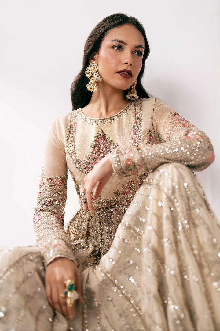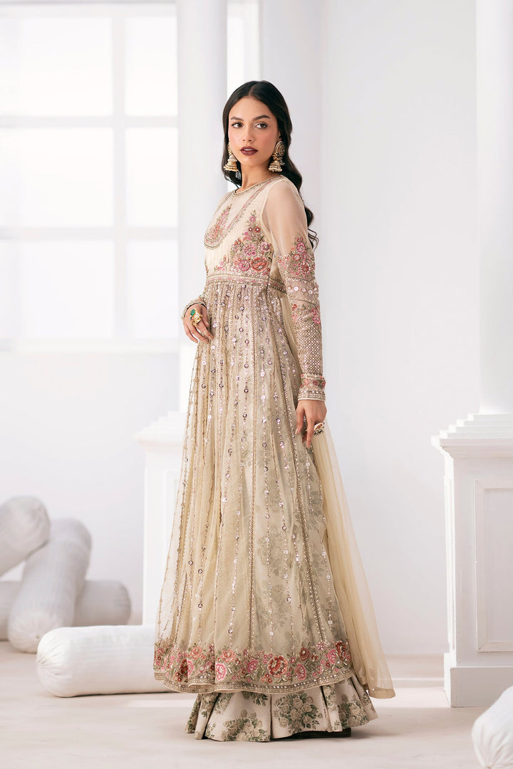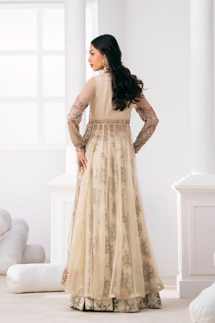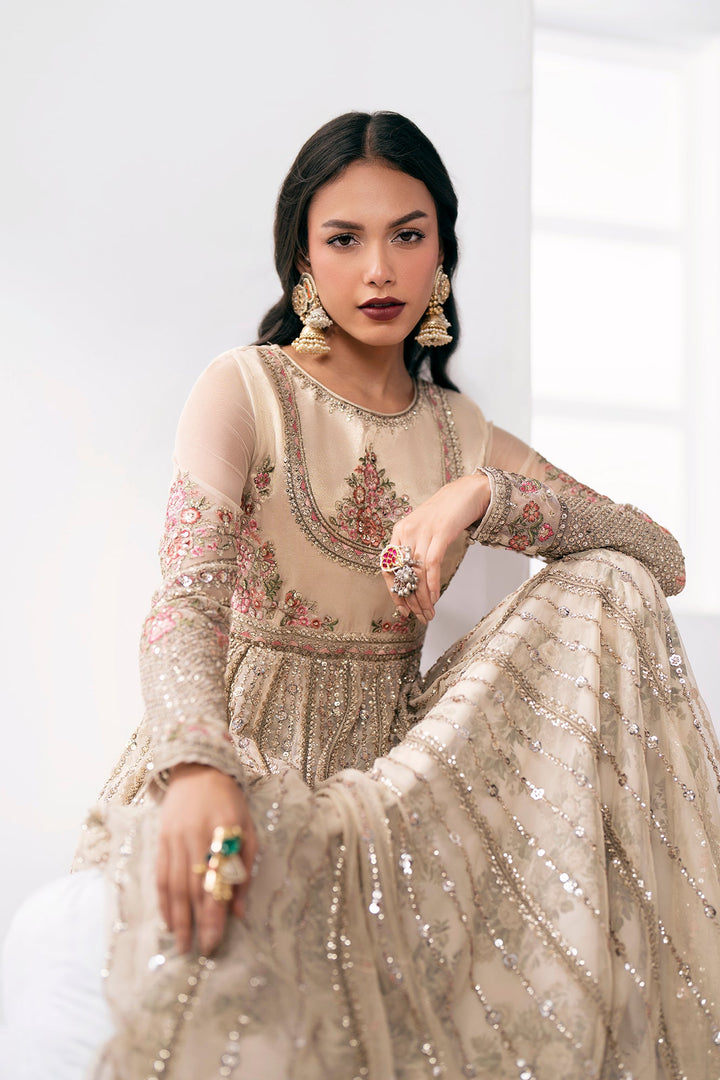 Drape yourself in ethereal elegance with this breathtaking embroidered pishwas and lehenga. The flowing pishwas, in a soft off-white, is a masterpiece of design, with a richly embellished bodice and long, sheer sleeves. The intricate embroidery in shades of pink, green, and gold creates a stunning, regal pattern. The pishwas is adorned with delicate sequin work, adding a subtle sparkle as you move. This magnificent piece is layered over a beautiful lehenga that peeks out from beneath the pishwas, featuring a beautiful floral print in muted tones. This suit is the perfect choice for a grand celebration, ensuring a look that is both luxurious and unforgettable.