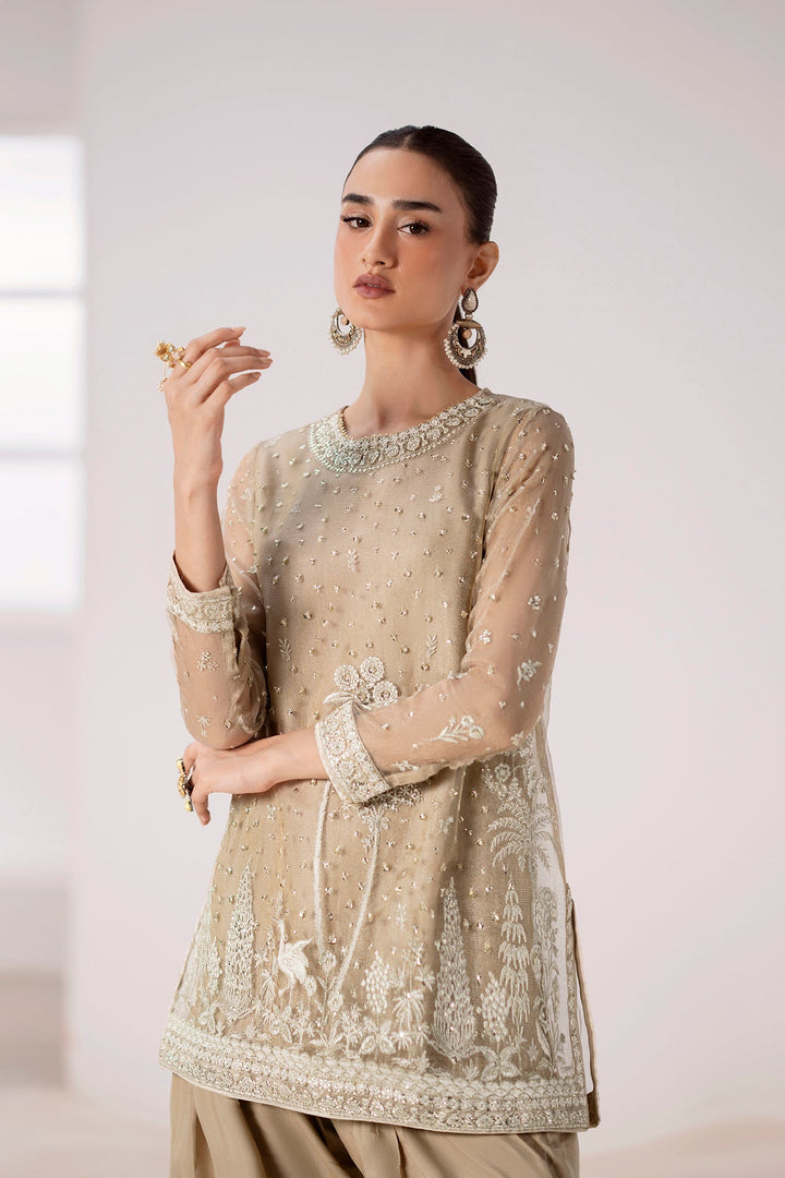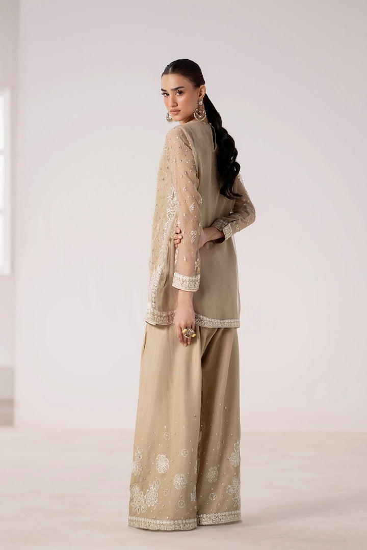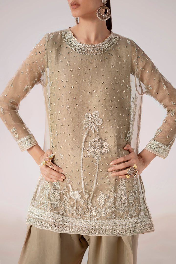 Adorn yourself in timeless grace with this exquisite embroidered suit. Crafted from a sheer zari net in a soft beige, the shirt is a masterpiece of delicate design, featuring shimmering white and silver floral and vine embroidery. The beautifully embroidered neckline adds a touch of refined charm, while the full-length sleeves create a graceful silhouette. This stunning piece is worn over a raw silk slip and is completed with a matching shalwar, also adorned with elegant floral embroidery at the hem. This suit is the perfect choice for a special occasion, blending traditional craftsmanship with a sophisticated and unforgettable style.