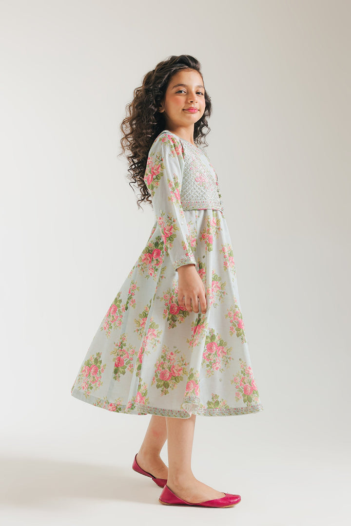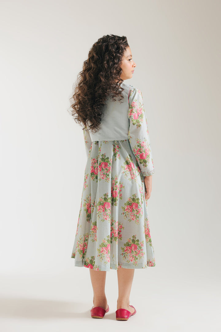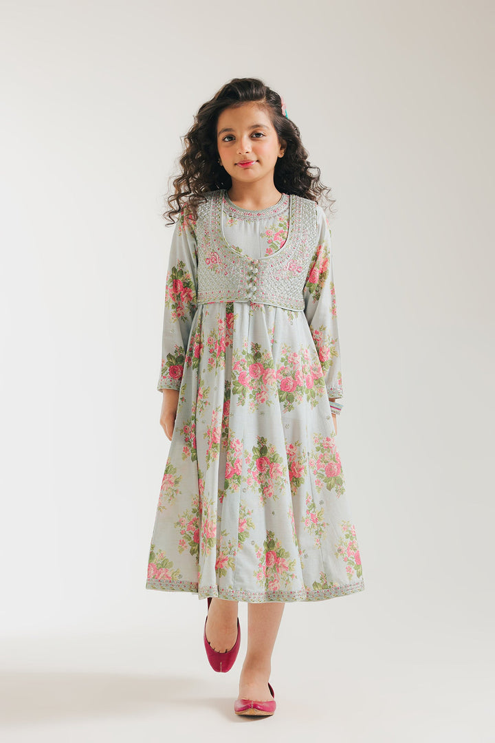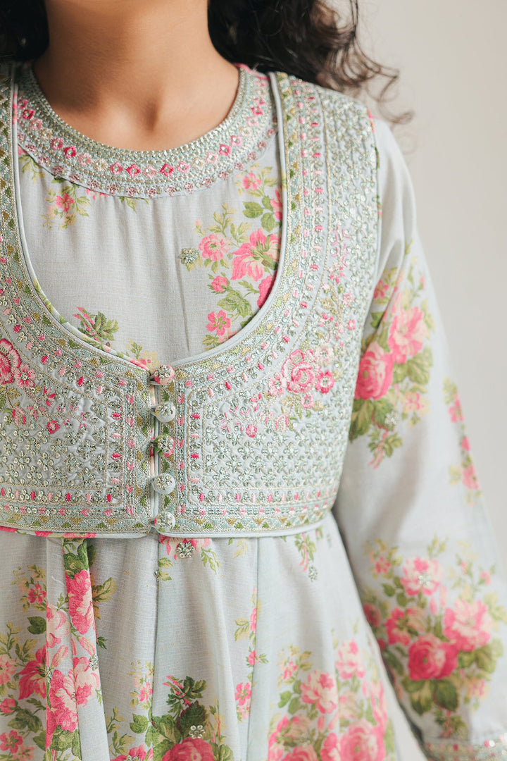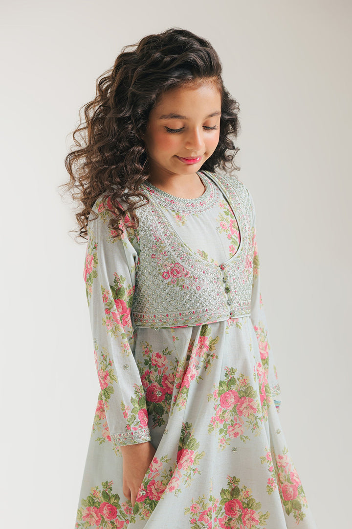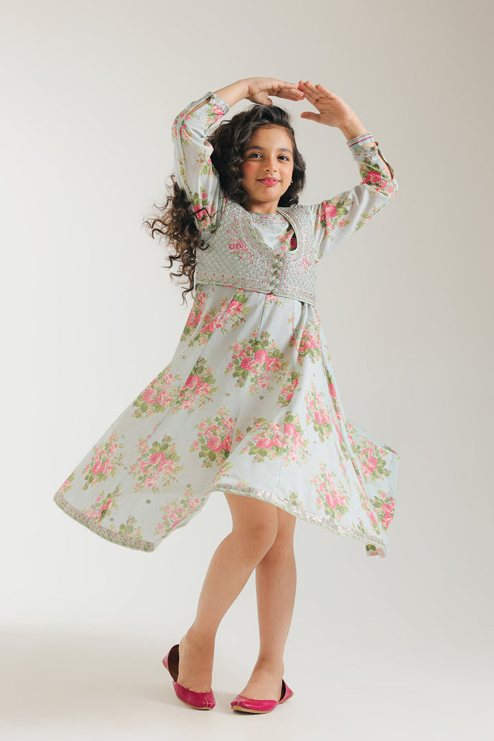 This stunning pishwas features a refined and sophisticated design, with a classy flared silhouette. The garment seamlessly incorporates elegant floral embroidery with scintillating details layered on a beautifully printed pastel green canvas. Paired with a traditional embroidered waistcoat, making it a must-have for any girl looking to elevate her style this festive season.