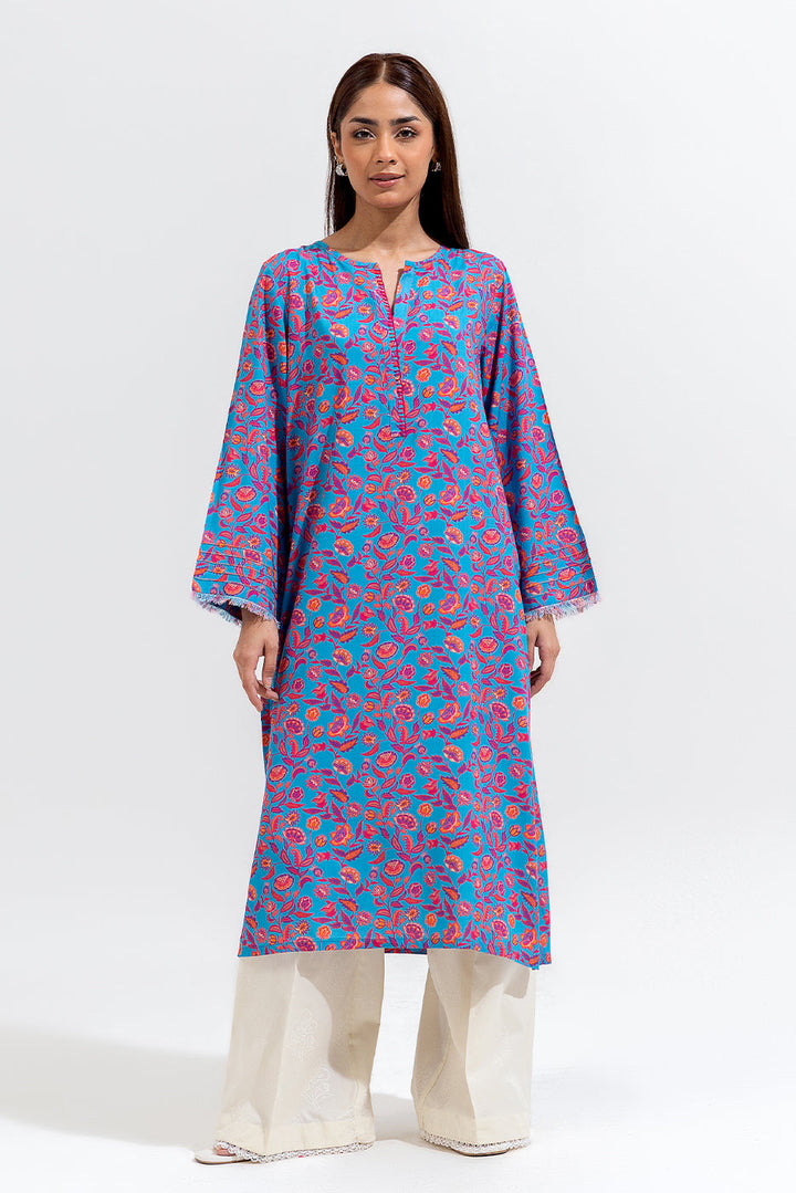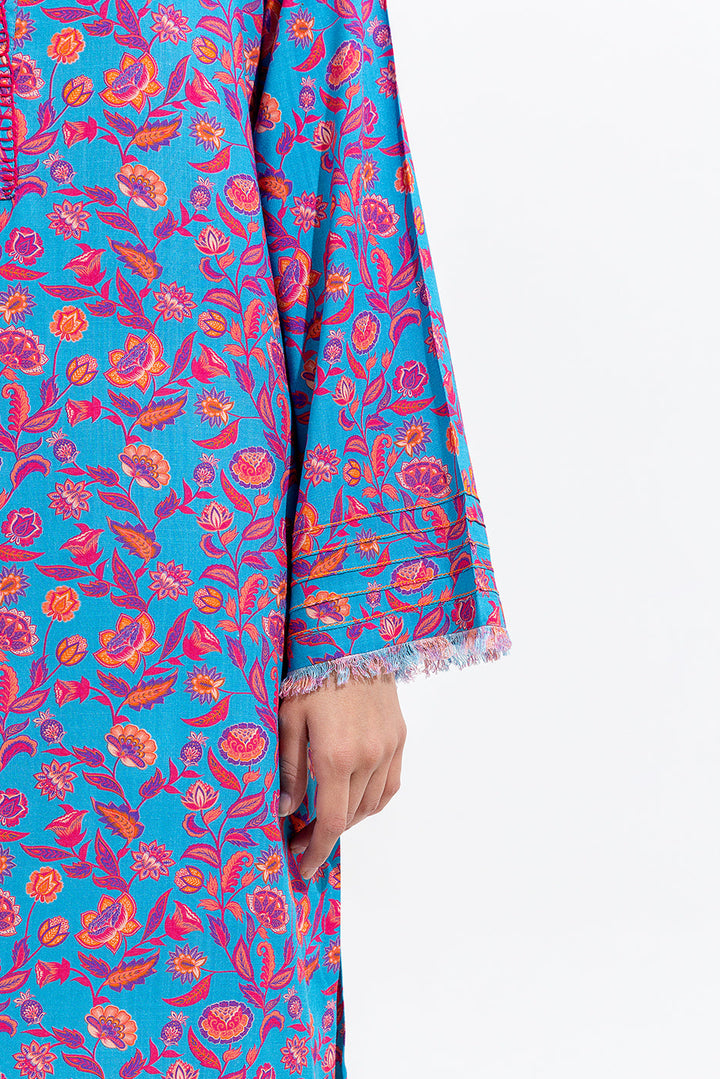 - Description: Printed Shirt With A Round Neckline Having Hand Stitches On The Placket With Sleeves Having Pin Tucks And Fray Edges.