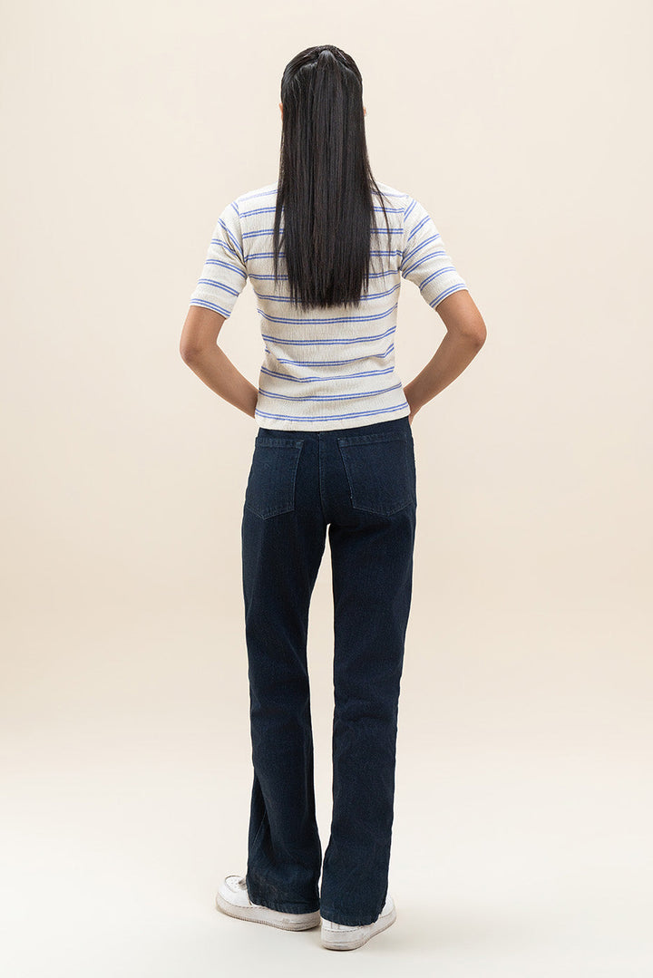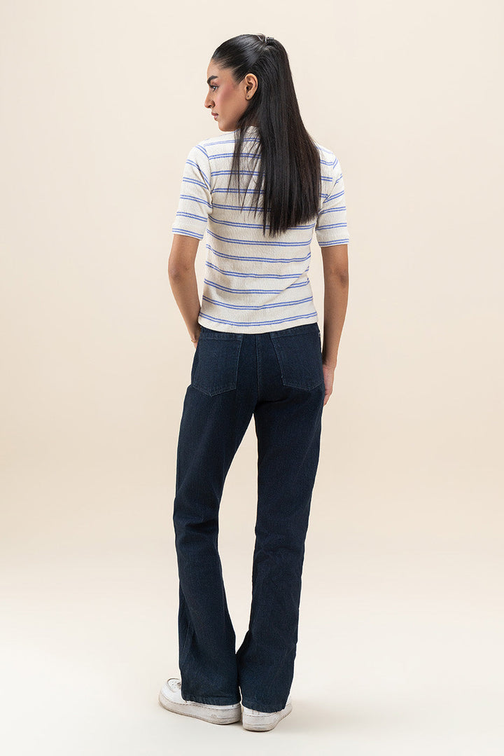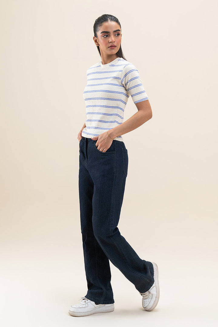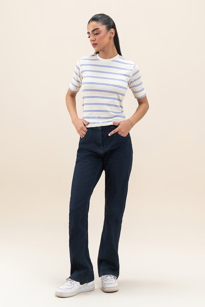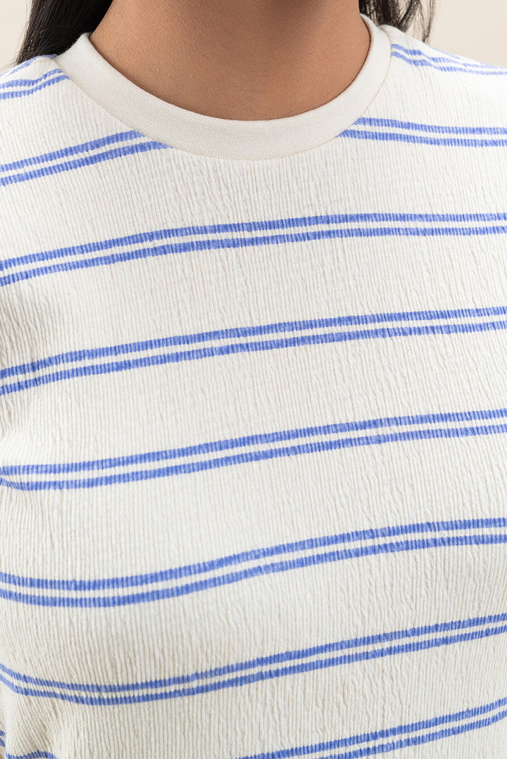 - Description: Sear sucker body hugging T-shirt with crew neck and above elbow sleeves.