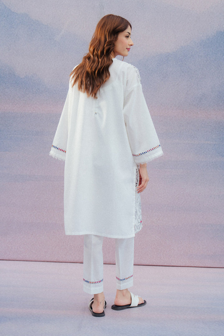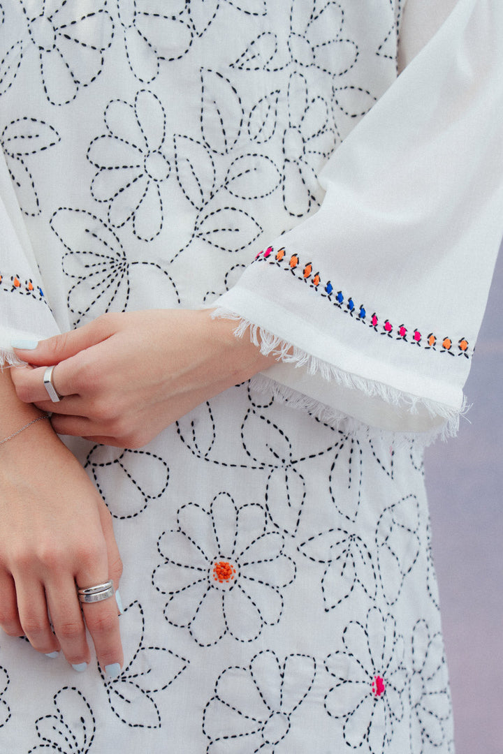 - Description: Hand Embroidered Shirt With Round Neckline And Sleeves With Frayed Edging Detail. Paired With Straight Pants To Complete The Look.