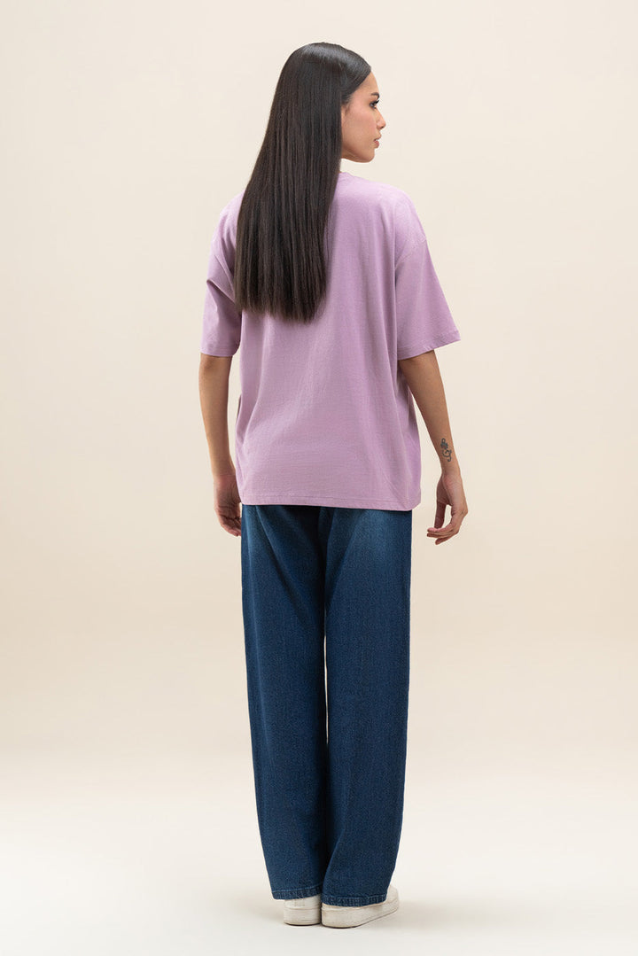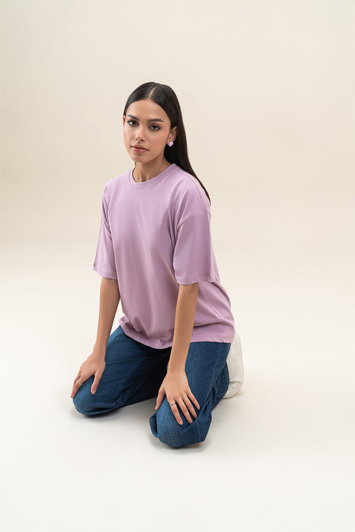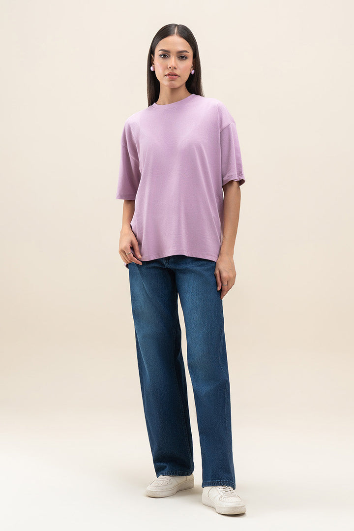 - Description: Crew neck t-shirt with drop shoulders and medium length.