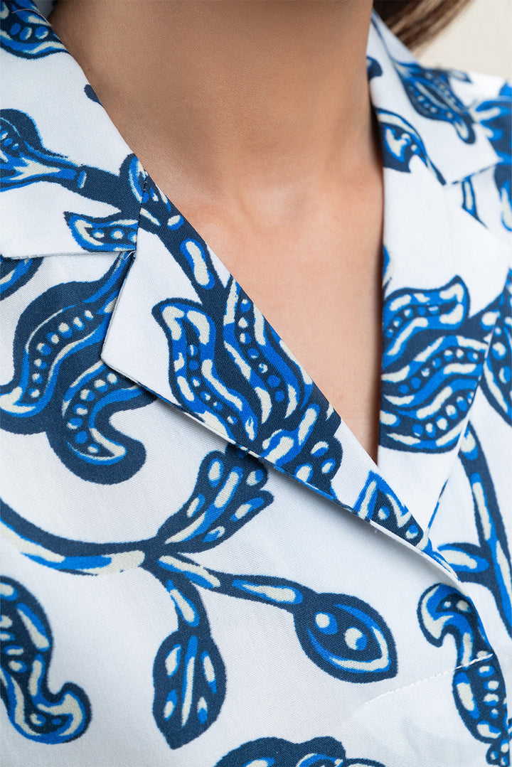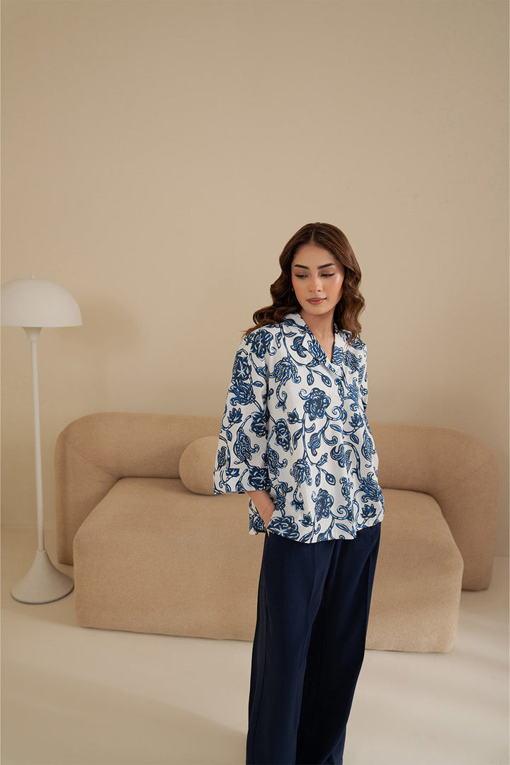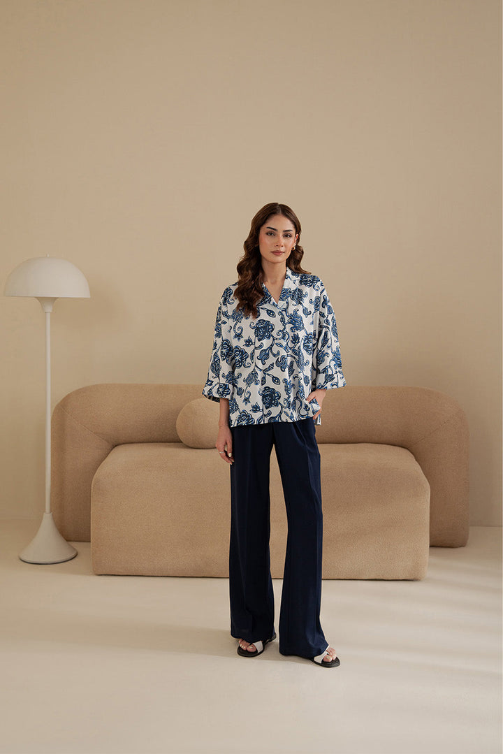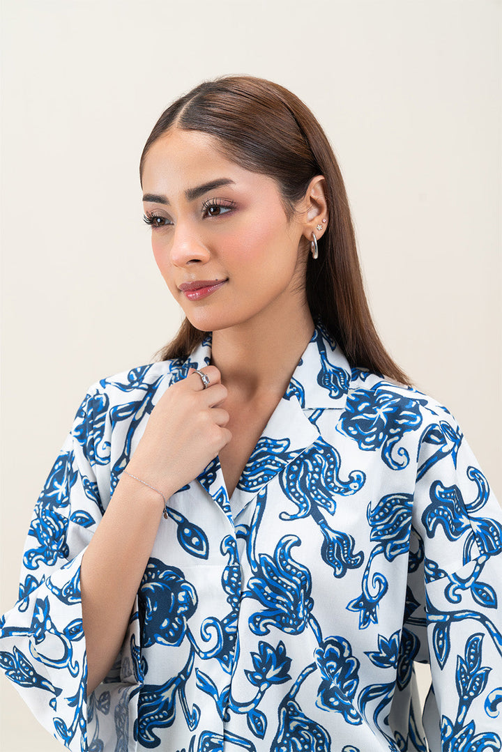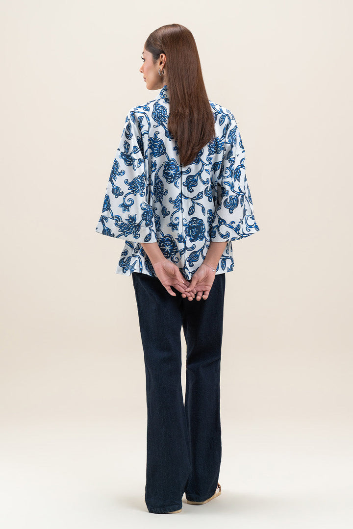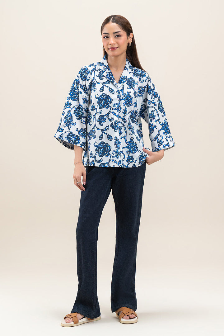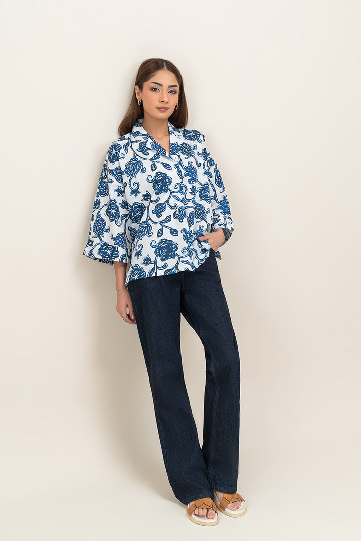 - Description: Printed Notch Collar Blouse With Below Elbow Folded Cuff Sleeves, Pleat On Front Along With Side Slit