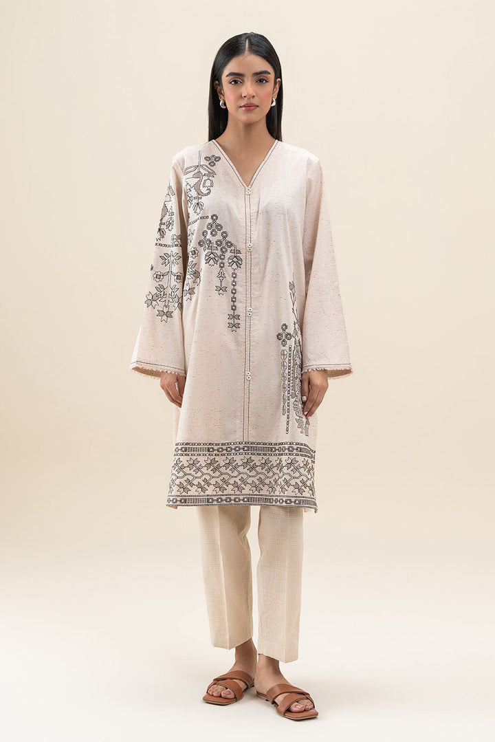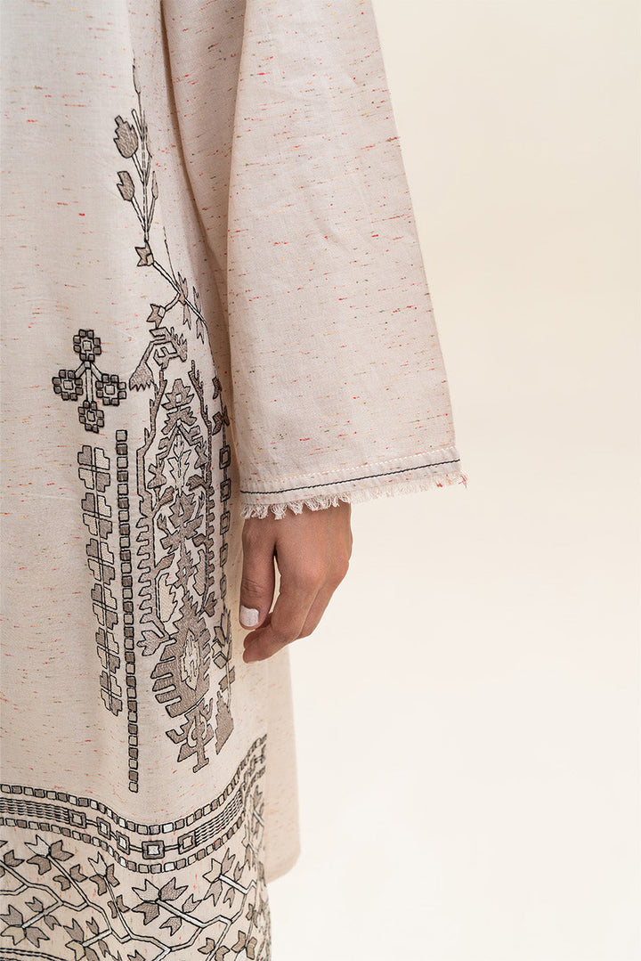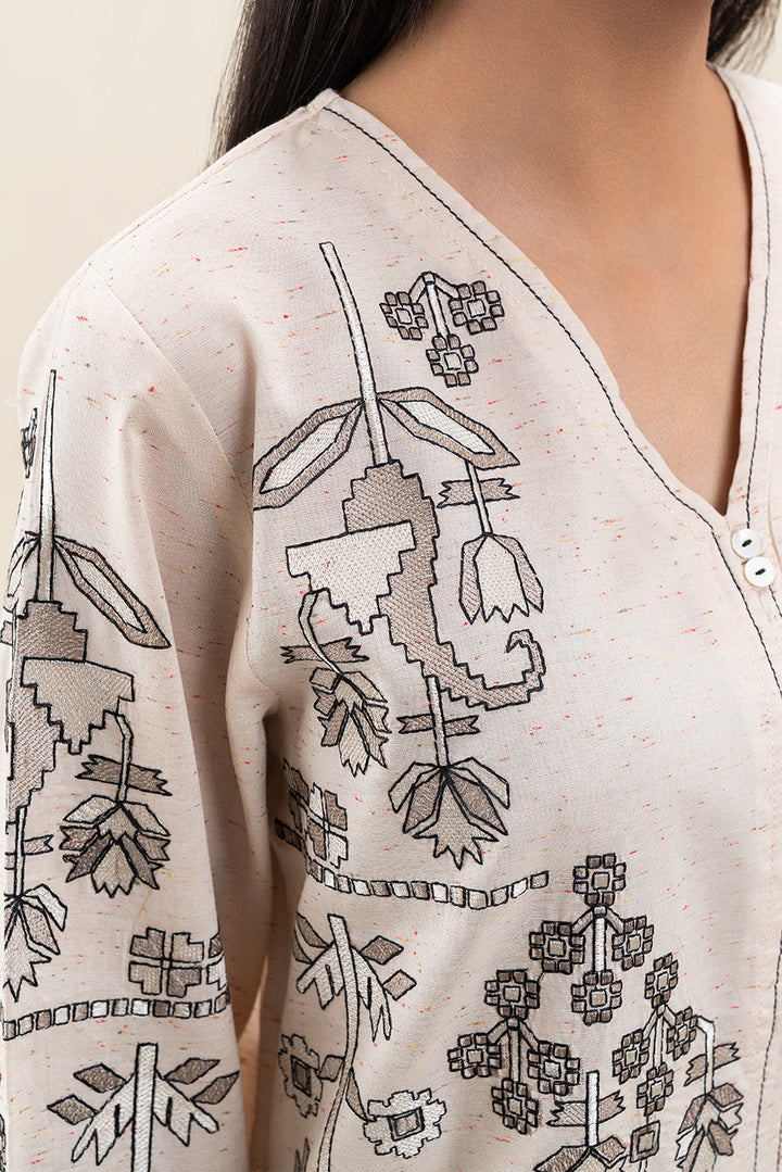 - Description: 2Pc.Embroidered Shirt With V Neck And Top Stitch Detail With Buttons.Embroidered Sleeves With Fray Edges.Paired With Straight Pants.