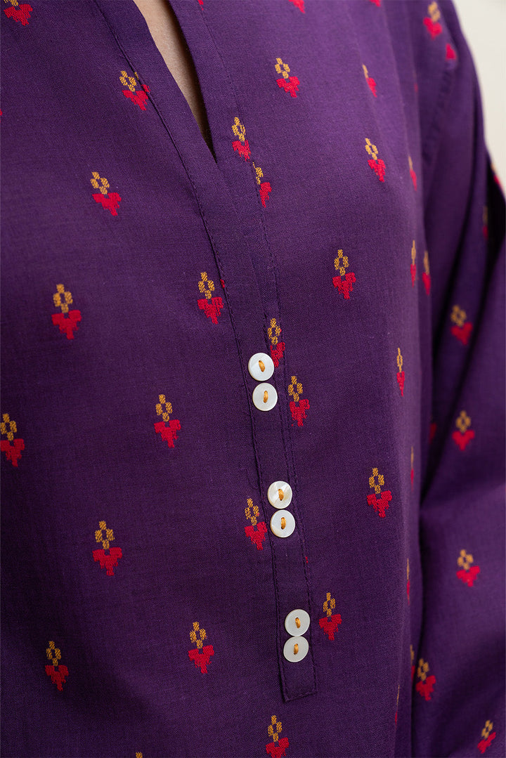 - Description: Jacquard Tunic With Band Collar Detail With Buttons. Embroidered Border On Sleeves