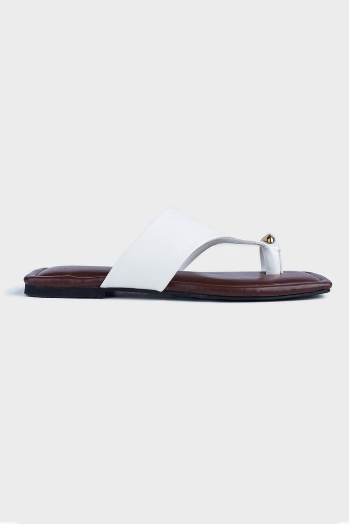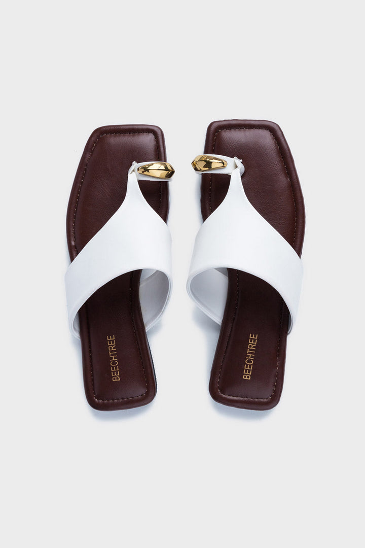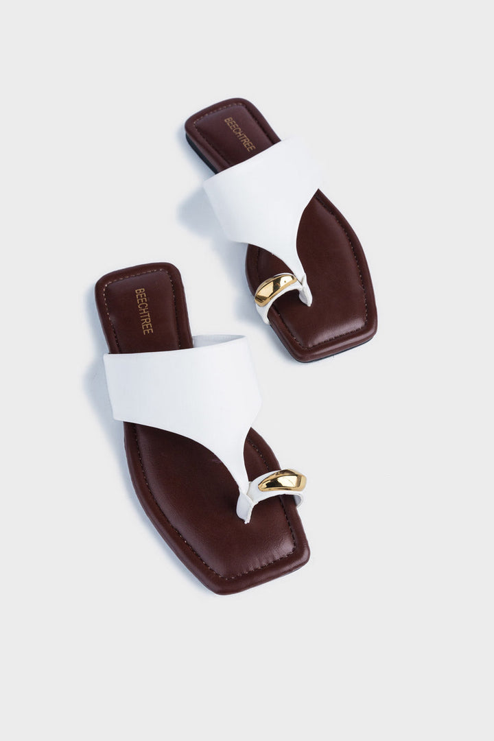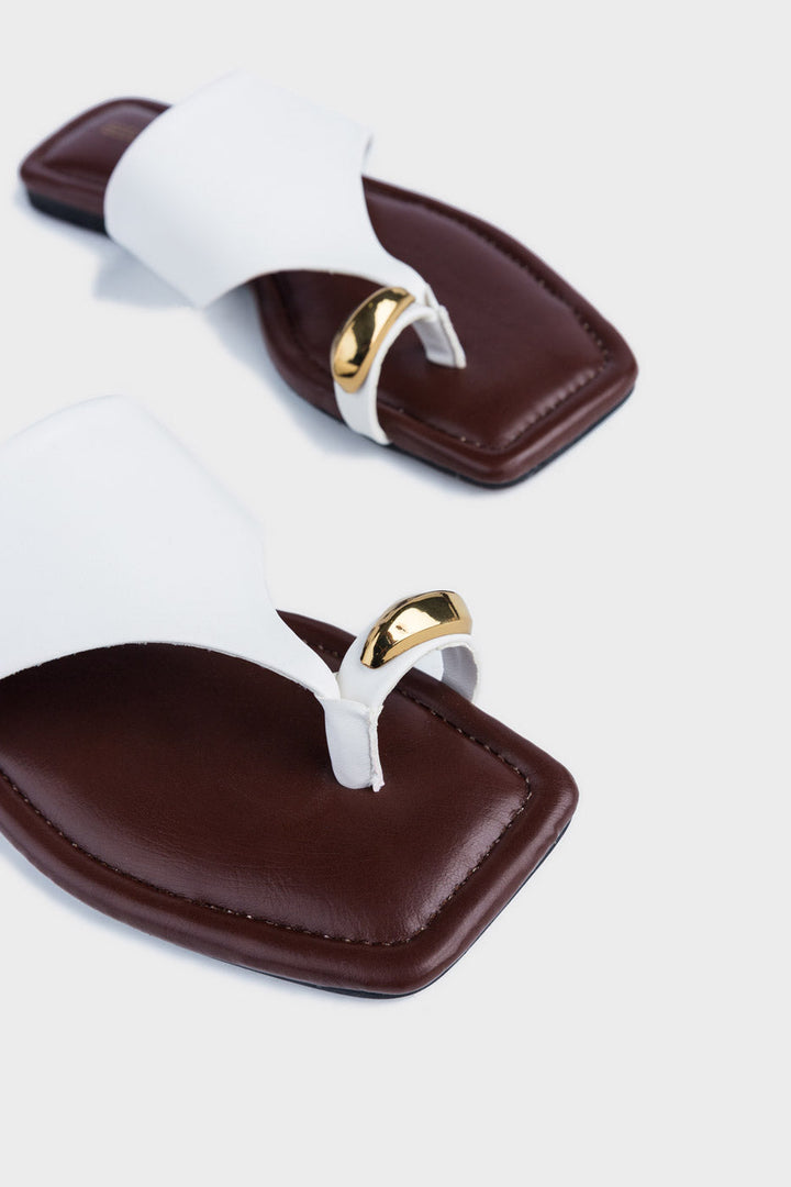 You can never go wrong with a pair of white flat sandals with asymmetric front straps and toe divider. Square-cut toe. From beech days to the office, this pair does it all.