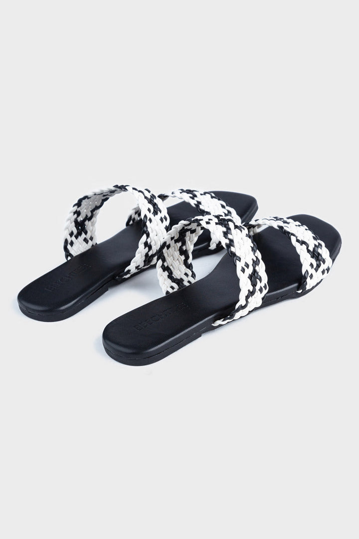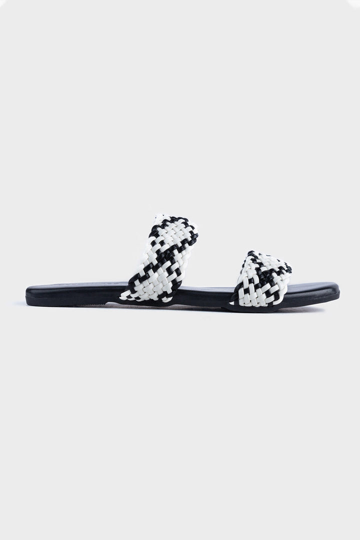 Make a bold statement with these striking monochrome double-strap slide sandals. Featuring a sleek black sole and intricately woven black-and-white braided straps, this design combines classic contrast with a modern edge. The dual-strap construction offers secure comfort, while the square toe silhouette adds a fashion-forward touch. Perfect for pairing with anything from casual jeans to flowy dresses, these sandals are your go-to choice for a chic, contemporary look.