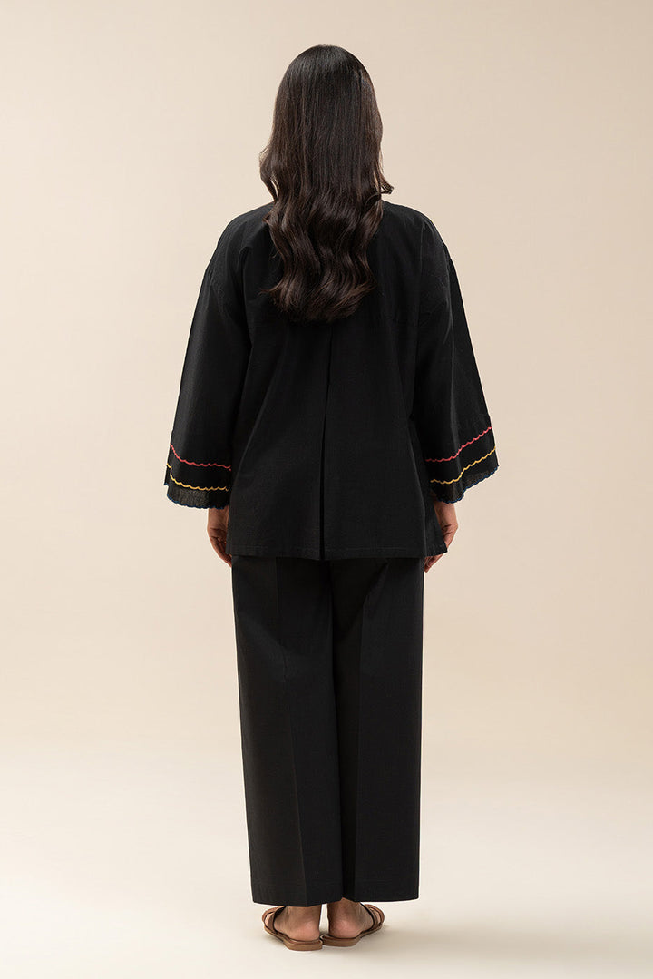 - Description: Embroidered Fusion Top With Round Neckline And Slit With Buttons Detail, And Contrasting Scallop Detail On Sleeves.