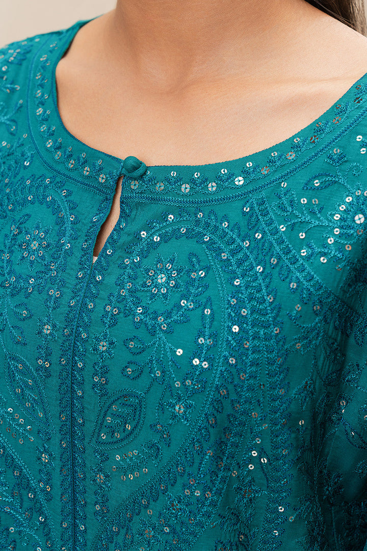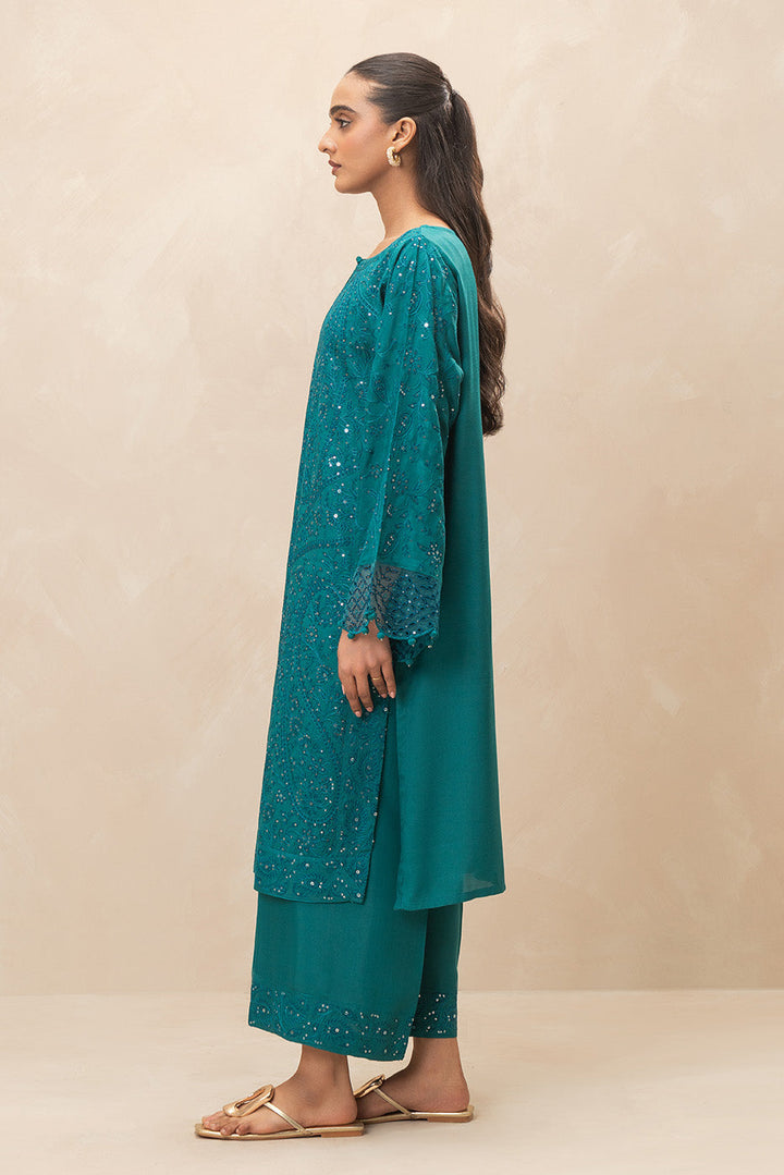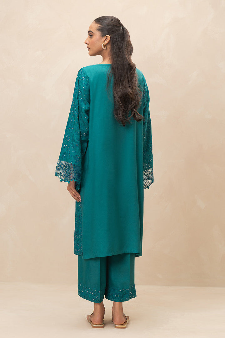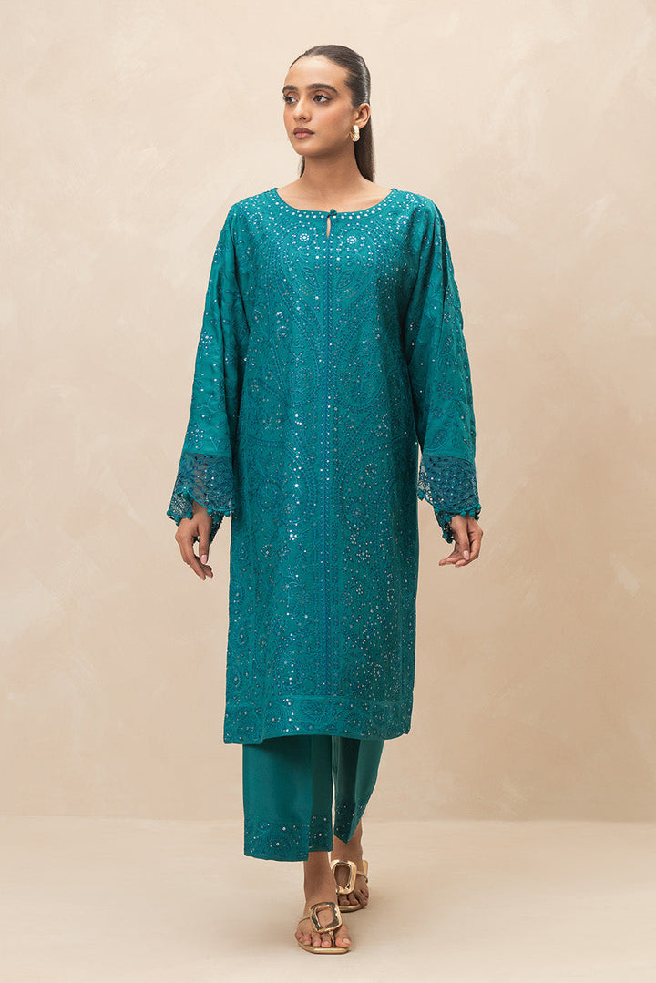 - Description: 2Pc.Embroidered Shirt With Boat Neck And Slit With Loops Button.Embroidered Sleeves With Organza Detail.Paired With Embroidered Culott.