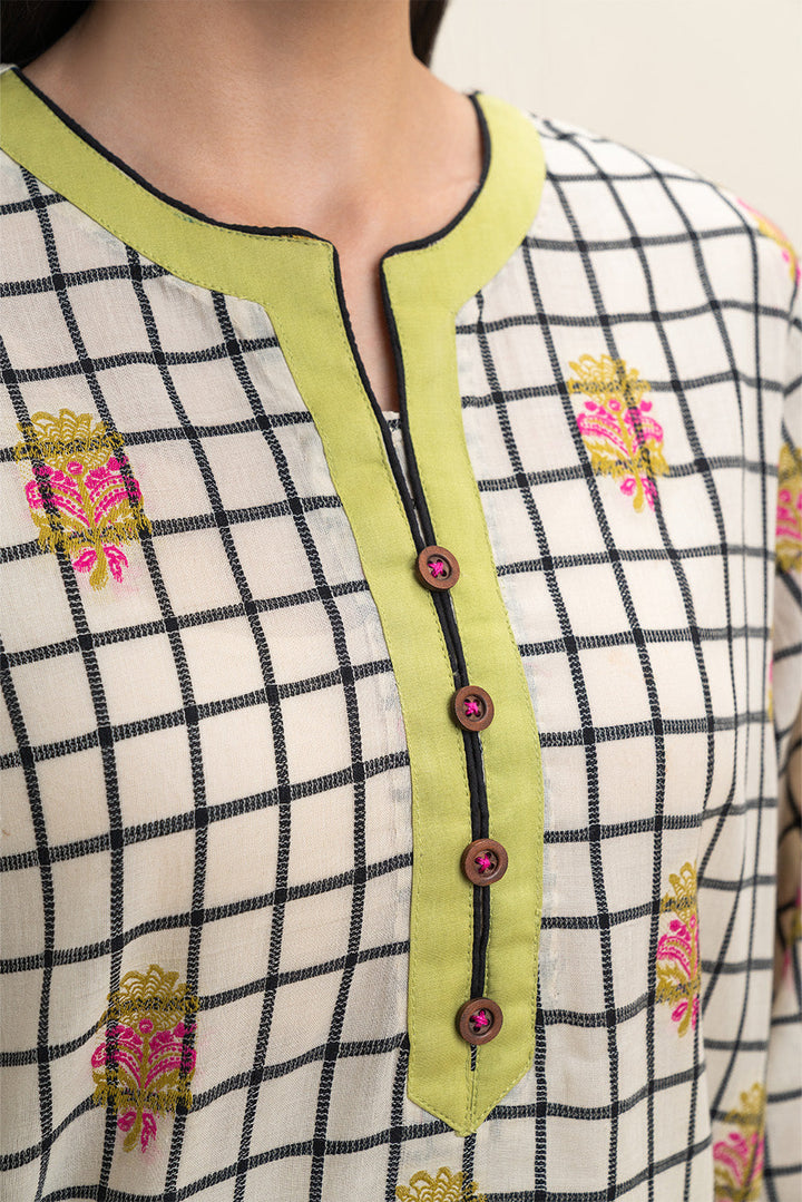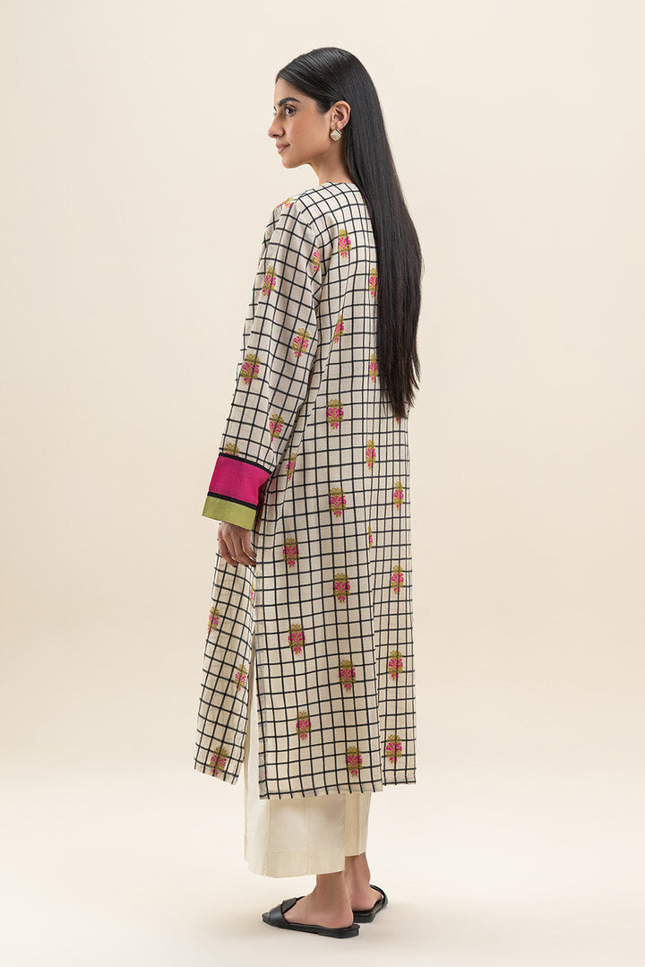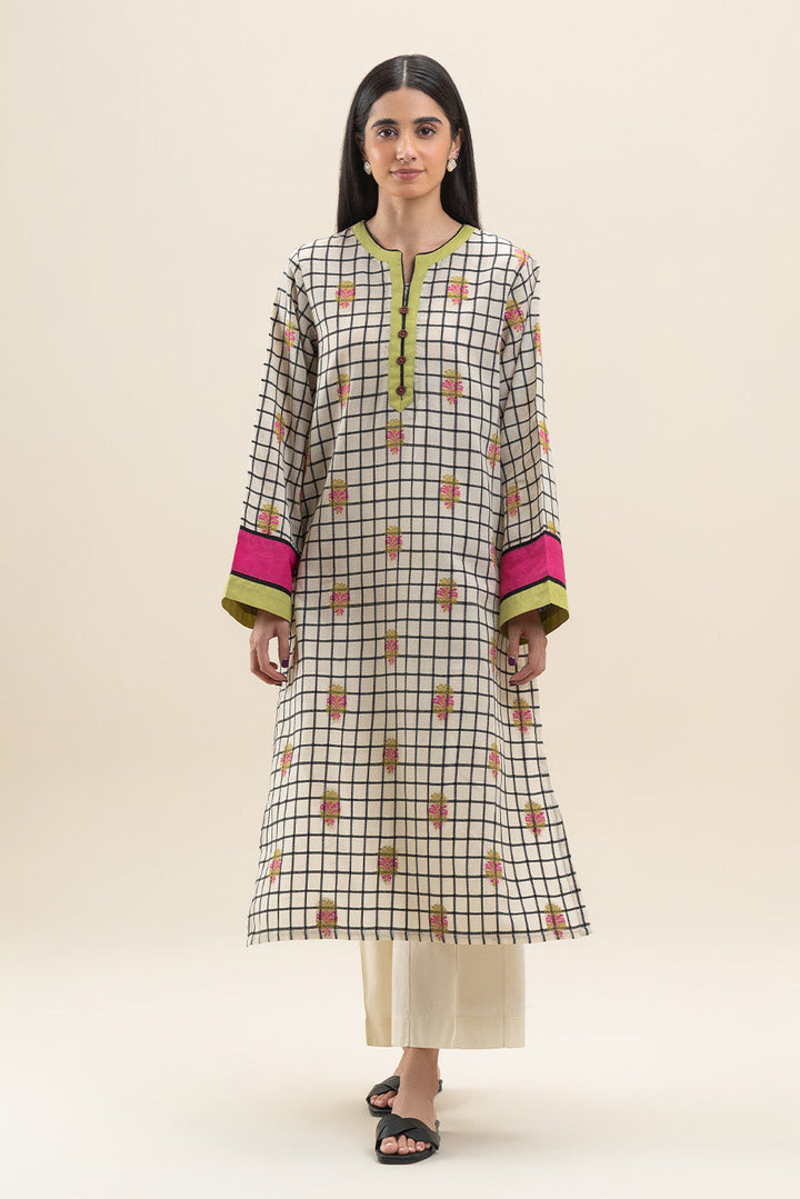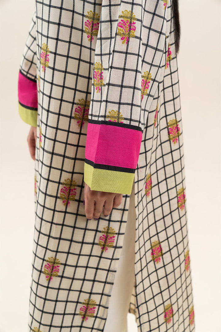 - Description: Cream checkered shirt with colorful accents and vibrant pink cuffs for a bold, modern touch.