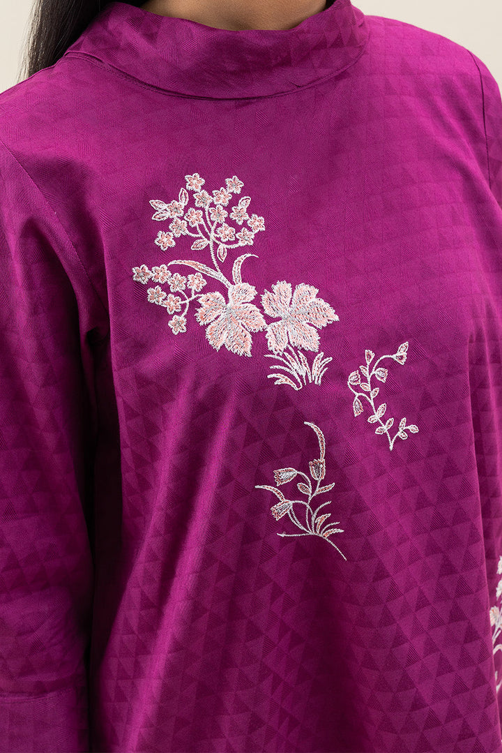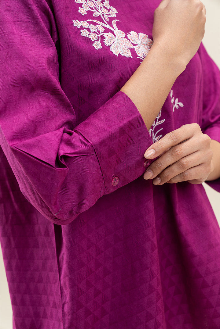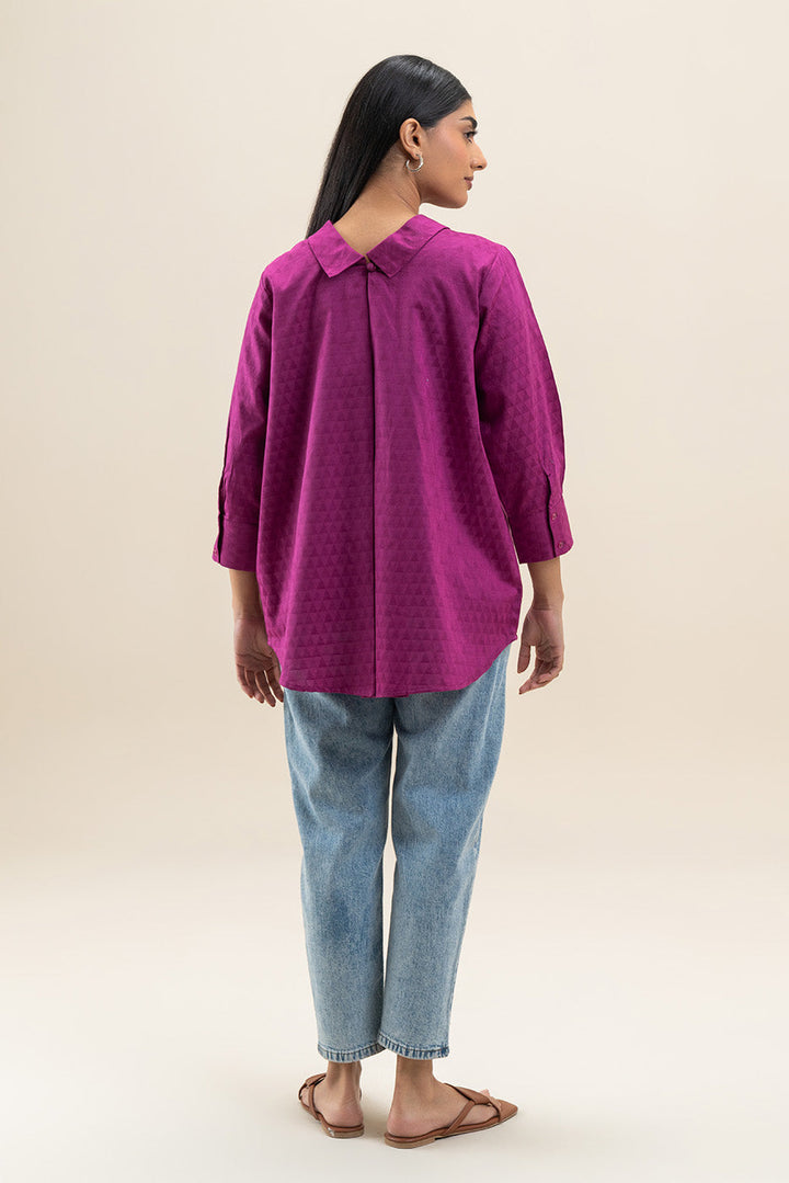- Description: Elegant magenta button-down top featuring a subtle textured pattern, collared neckline, and relaxed fit for a chic casual look
