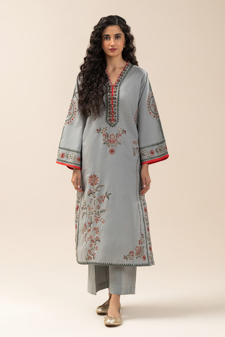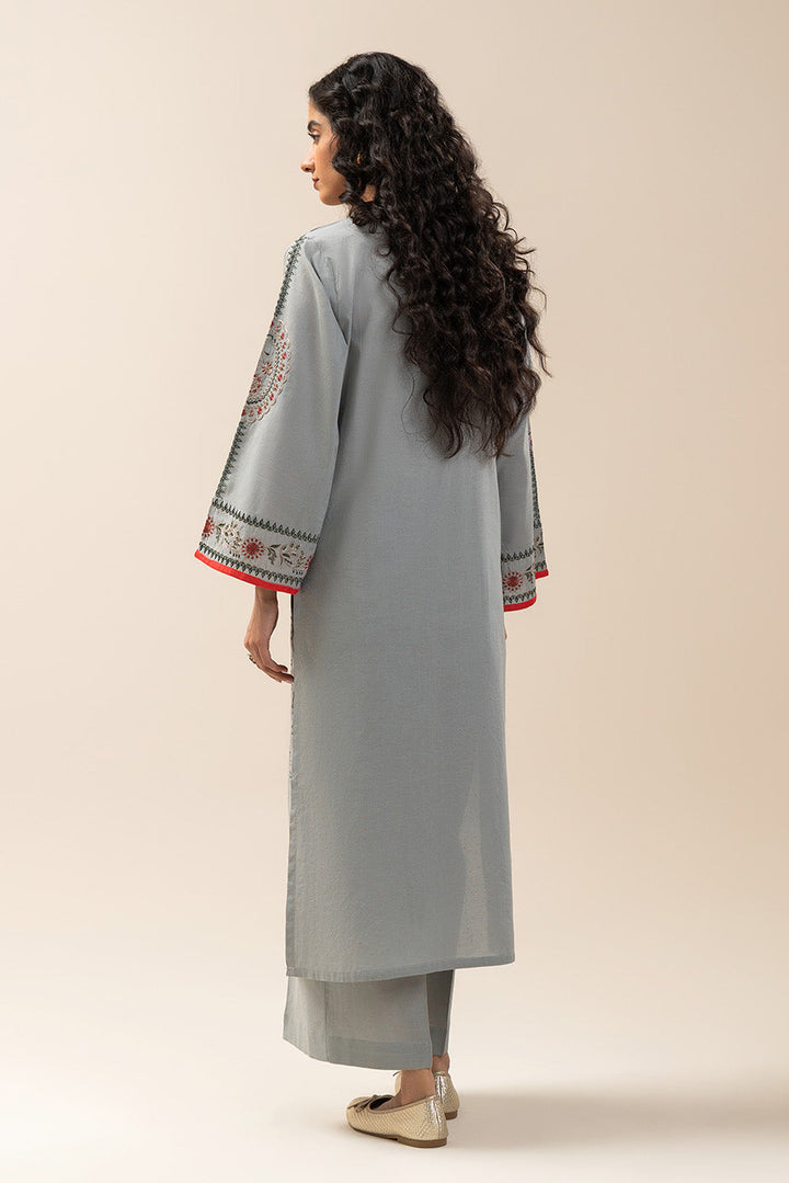 - Description: Embroidered shirt with accent color trim detail on neck and sleeves paired with straight pants to complete the look.