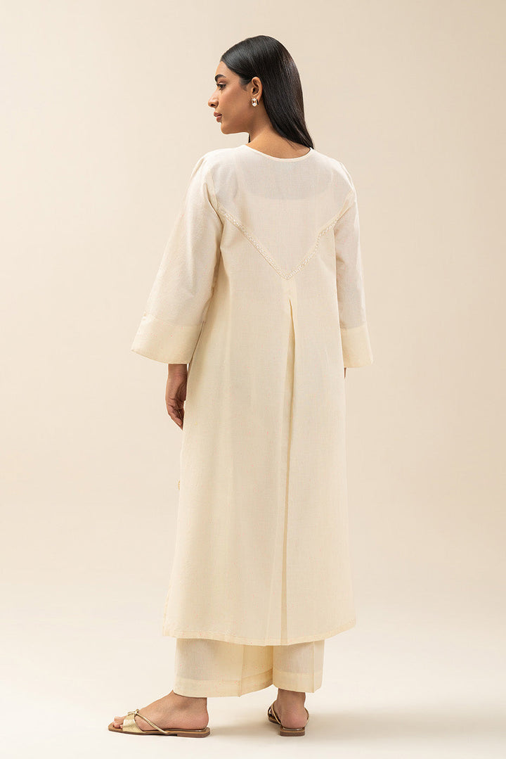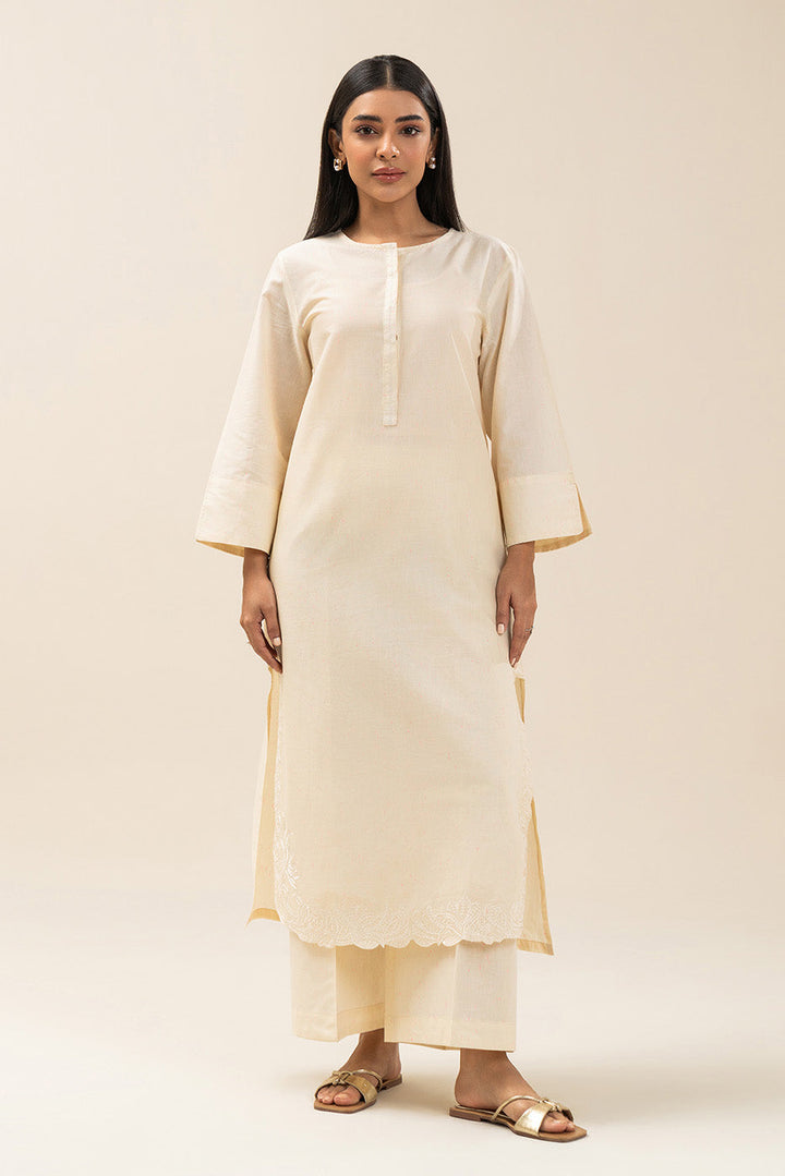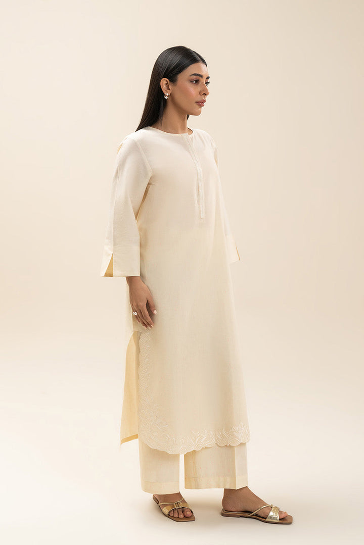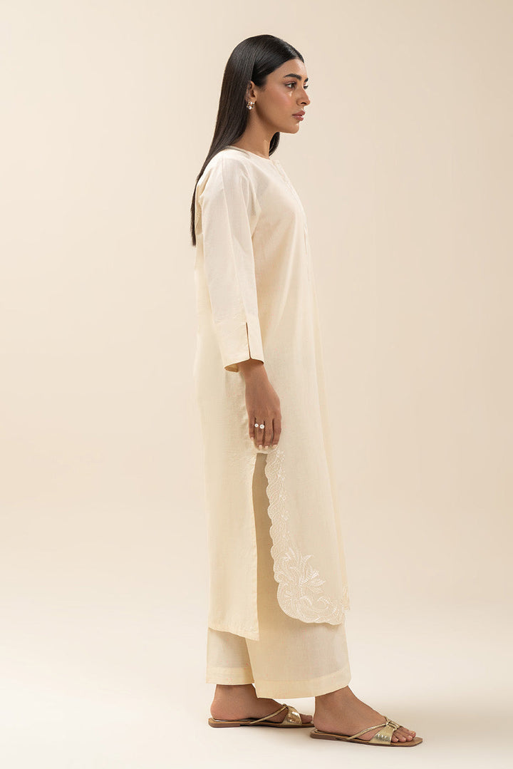 - Description: Band Collar Long Tunic With Embroidered Patch On Hem Finished With Cutwork Detail . Paired With Culotte Pants