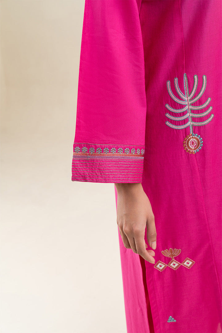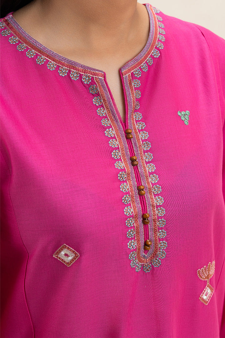 - Description: Embroidered shirt with button detail on front paired with straight pants.