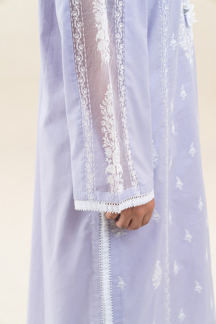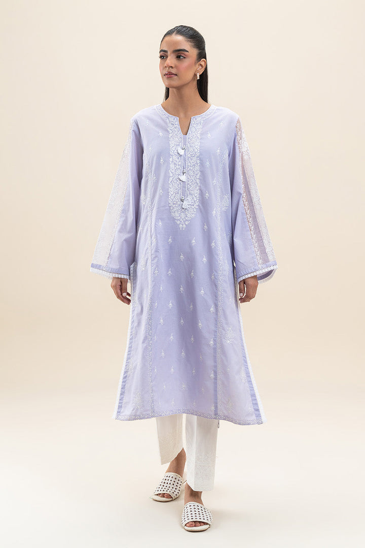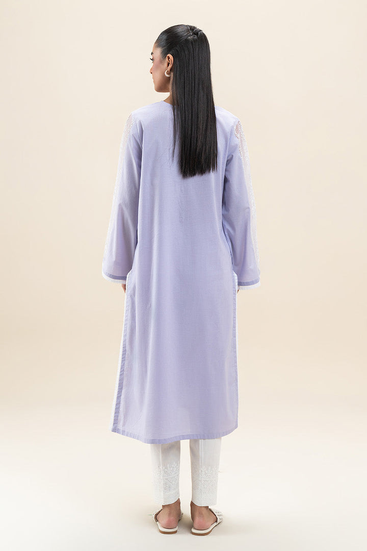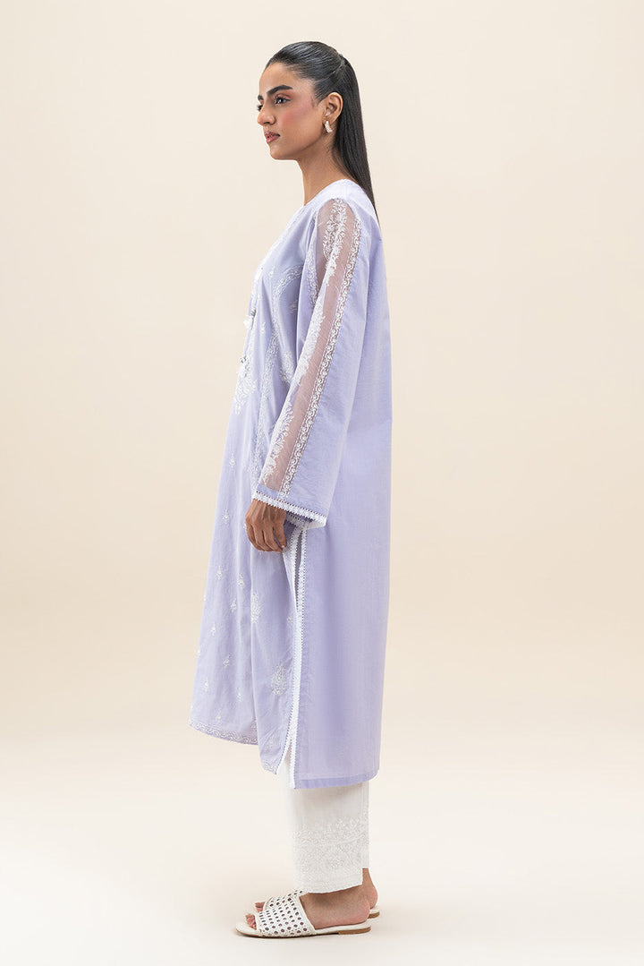 - Description: Embroidered Shirt With Round Neckline And Slit With Button Detail, And Organza Embroidered Inserts On Sleeves With Laces Inserts.