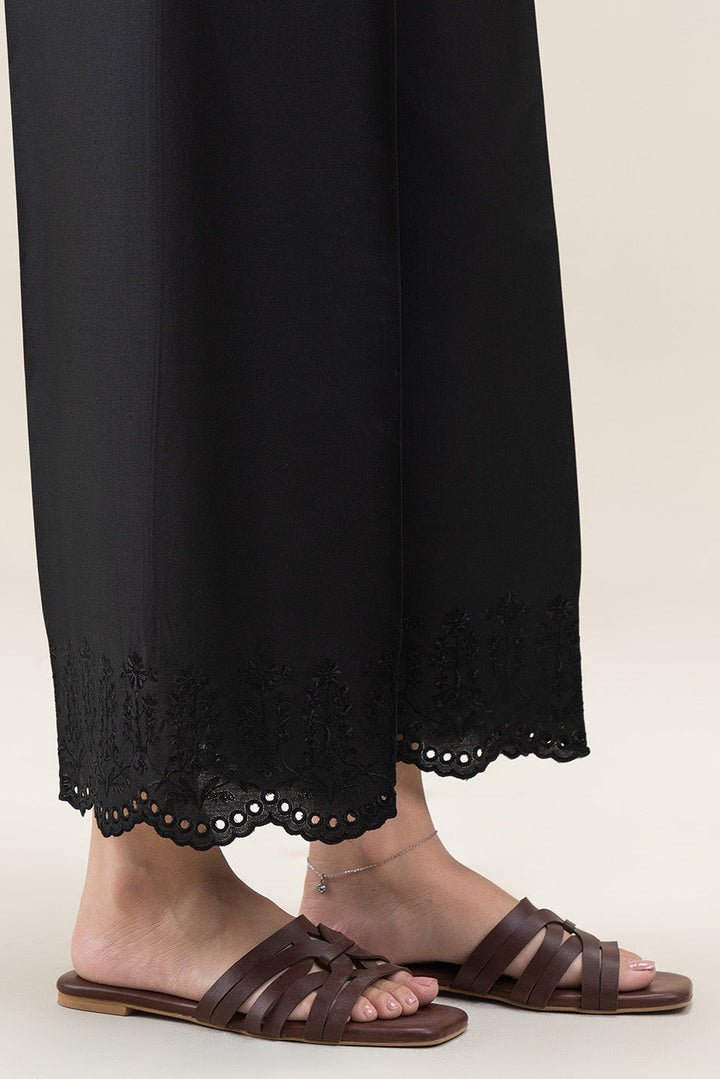 - Description: Black culotte pants featuring a scalloped hem with intricate embroidery for an elegant finish.