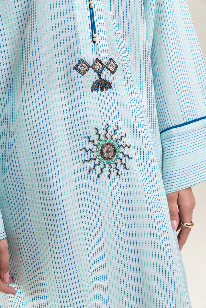 - Description: A breezy pastel blue striped shirt featuring wide sleeves, delicate detailing on the neckline, and statement tassels—perfect for an effortlessly elegant look.