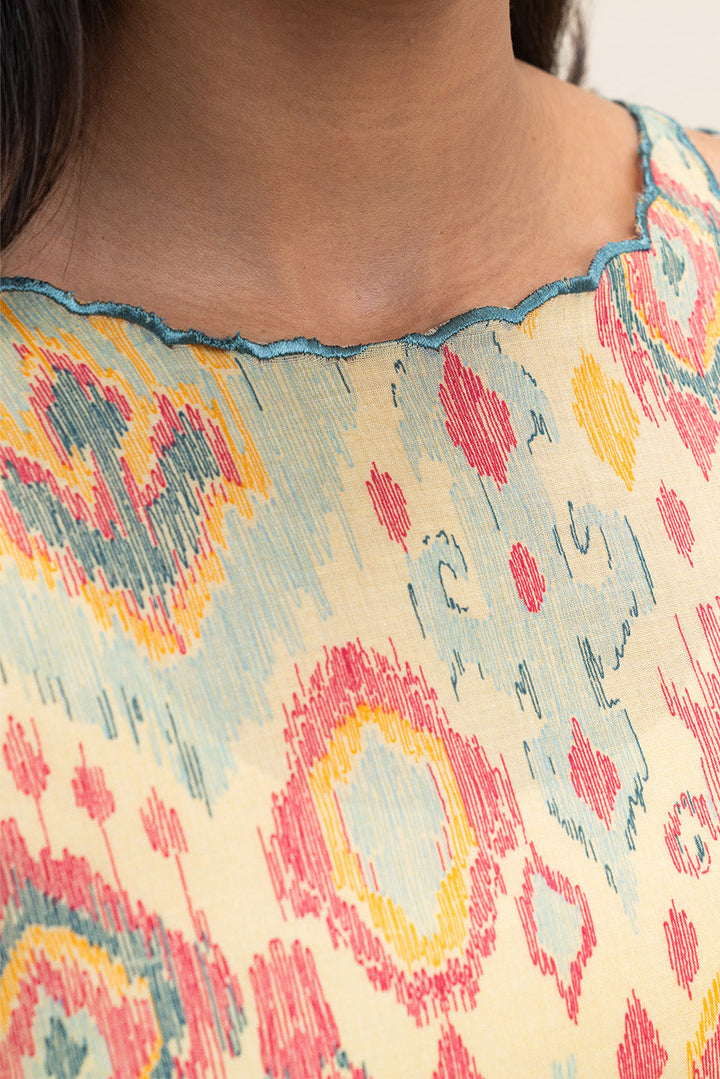 - Description: Printed co ord set with embroidery on sleeves . Paired with straight pants.