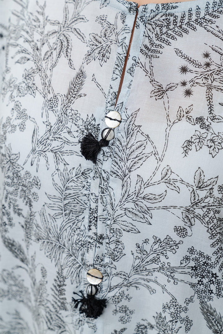 - Description: Extended Shoulder Shirt With Boat Neckline And Placket With Button Detail And Laces Inserts On Sleeves.