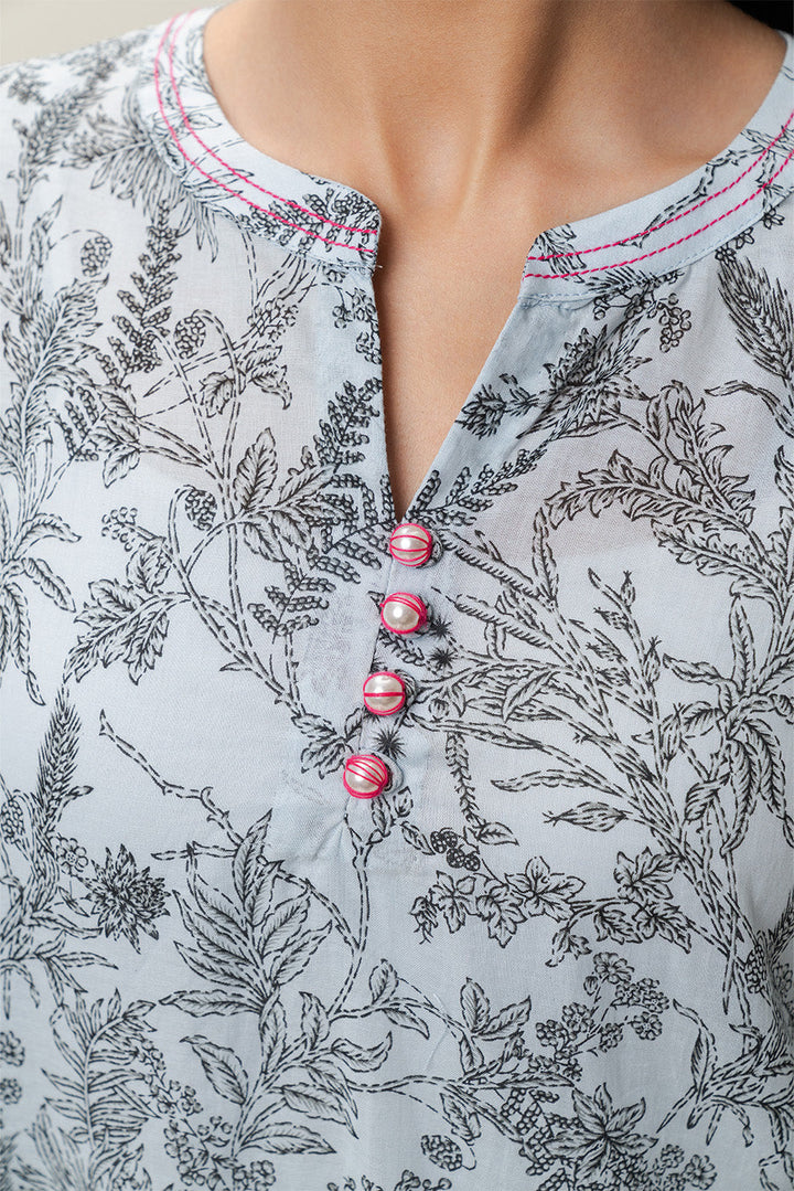 - Description: Basic Printed Coord Set With Band Collar And Placket With Buttons And Contrasting Top Stitches Detail On Front And Sleeves. Paired With Staright Pants To Complete The Look.