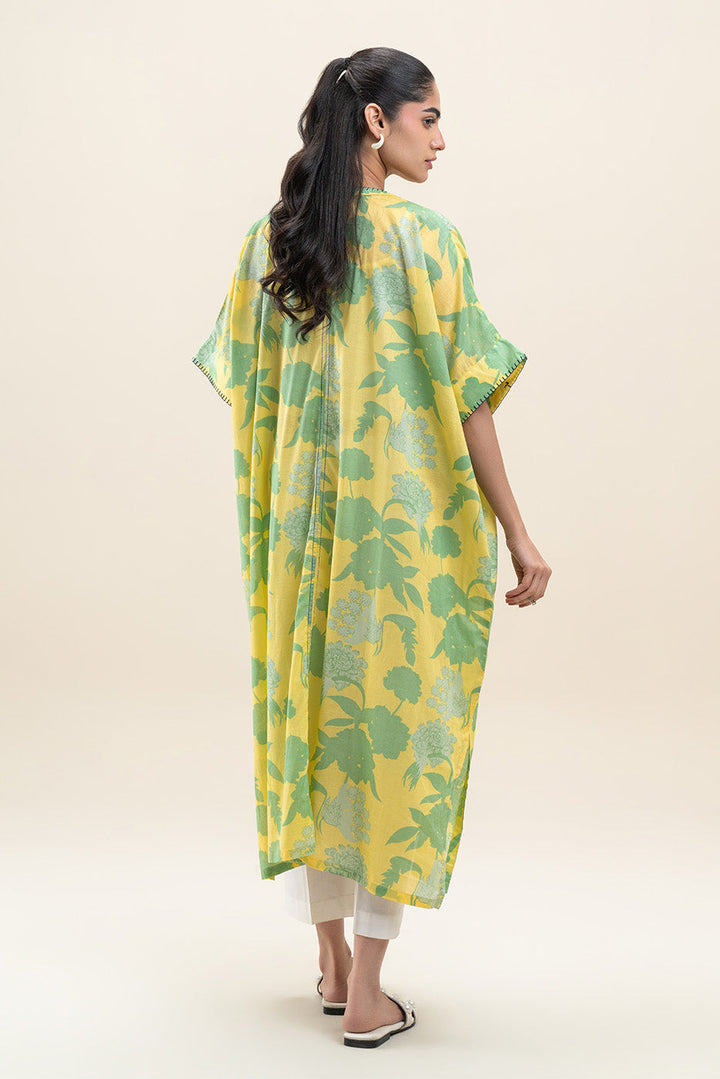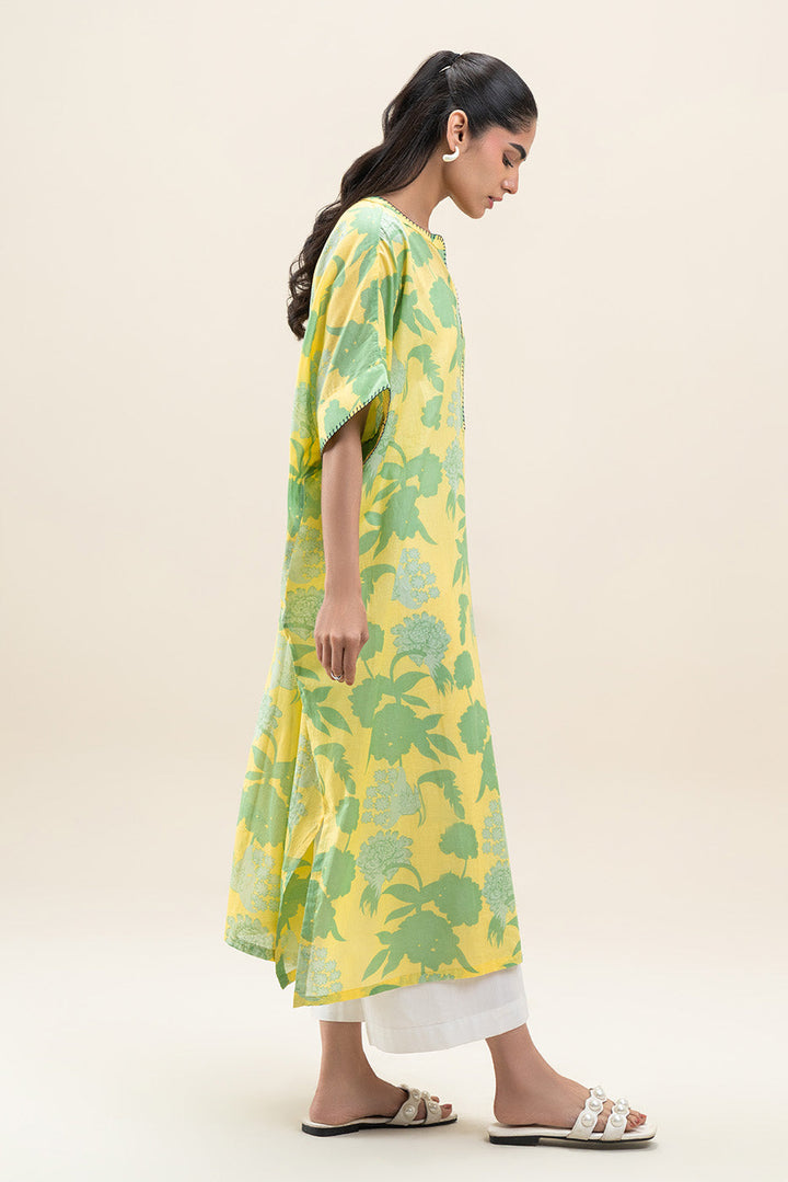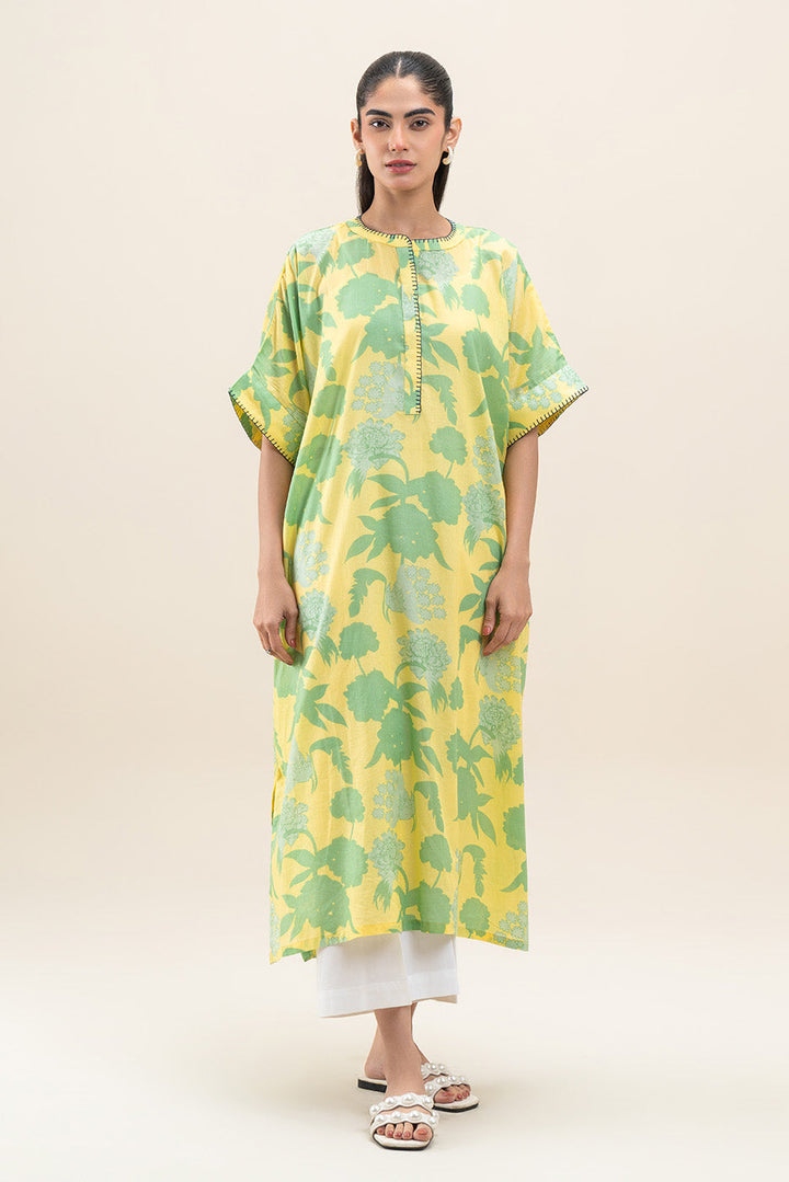 - Description: A breezy yellow kurta adorned with green floral prints, featuring relaxed sleeves and minimal detailing for an effortless summer look.