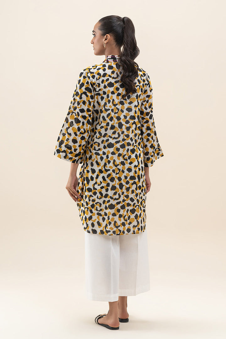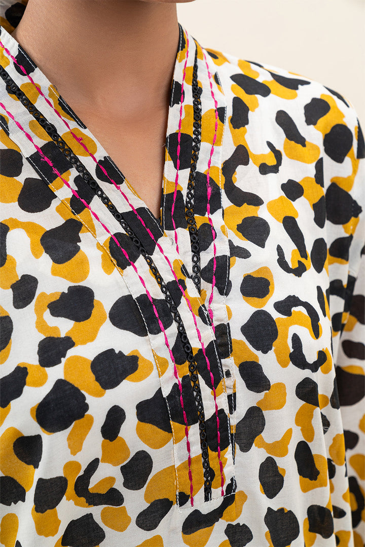- Description: This chic tunic features a bold yellow-and-black abstract leopard print, a tasseled V‑neck placket, and breezy three‑quarter sleeves for effortless, modern style.