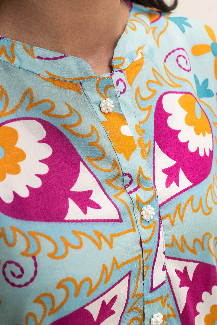 - Description: Printed two-piece set featuring a vibrant floral and geometric pattern for a bold, stylish look.