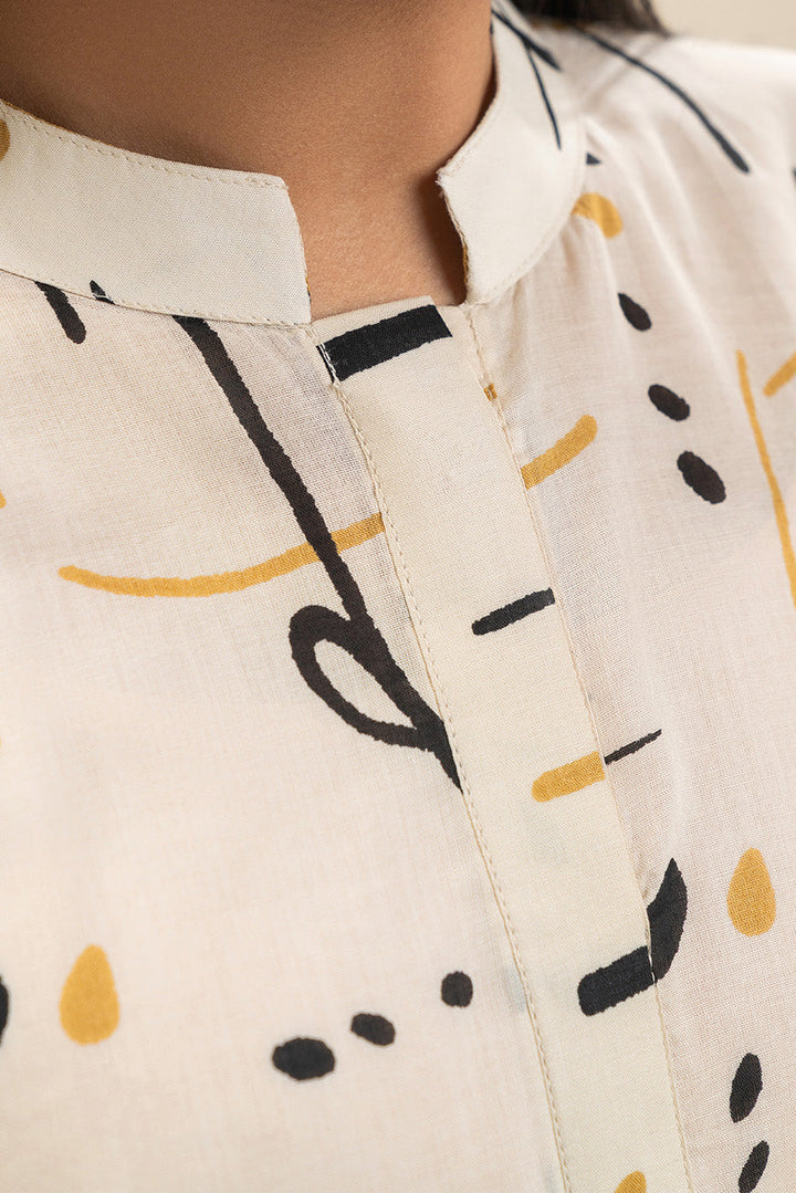 - Description: Band Collar Detail With Trim Insert. Long Printed Tunic Paired With Straight Pants