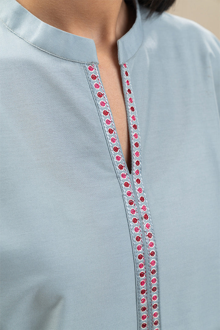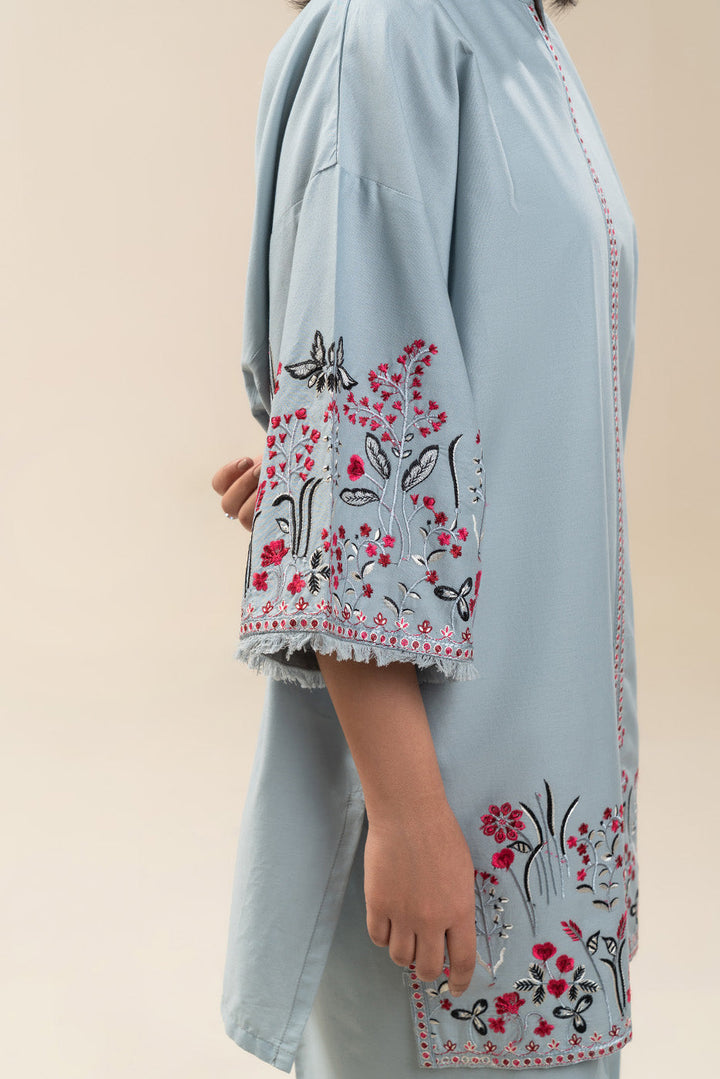 - Description: Embroidered Shirt With Band Collar And V-Slit And Frayed Edging Detail On Sleeves. Paired With Culotte Pants To Complete Th Elook.