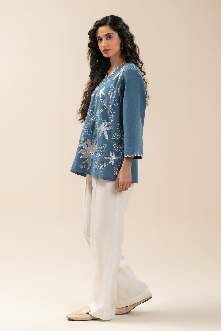 - Description: Blue top adorned with intricate white floral embroidery, featuring a V-neckline and relaxed sleeves for a sophisticated yet comfortable look.