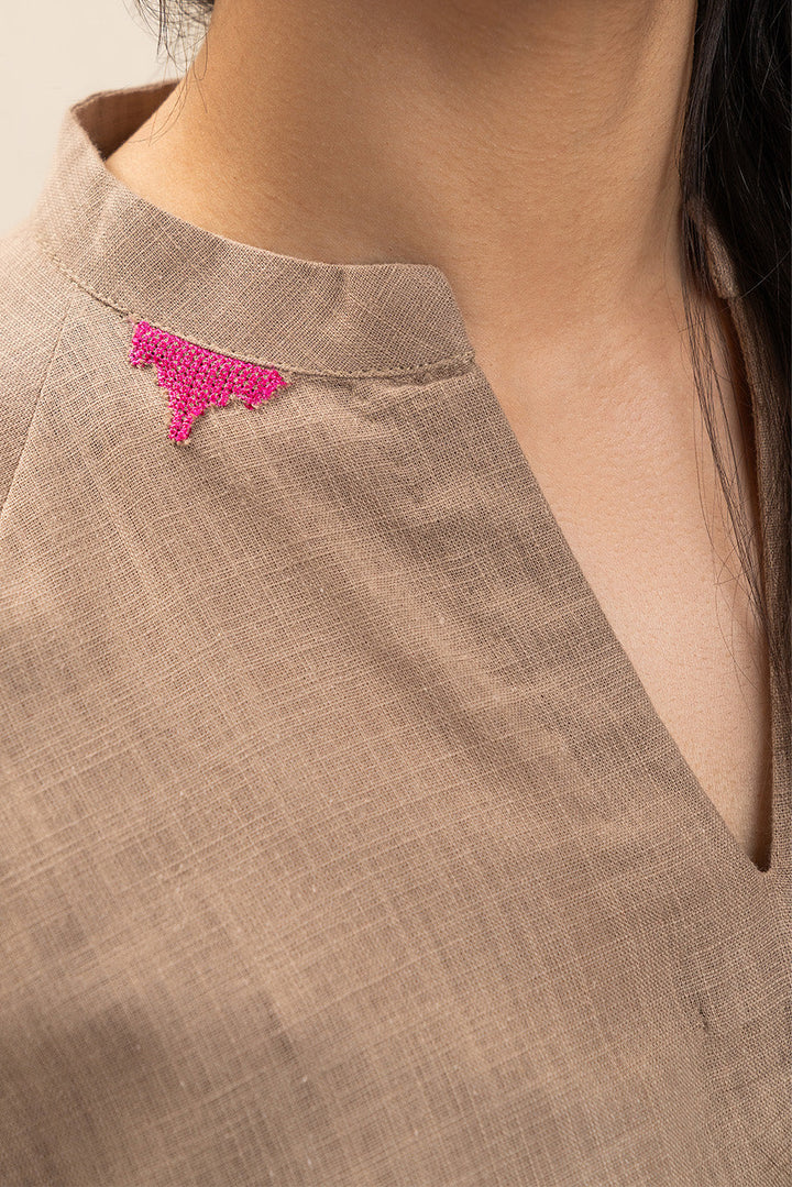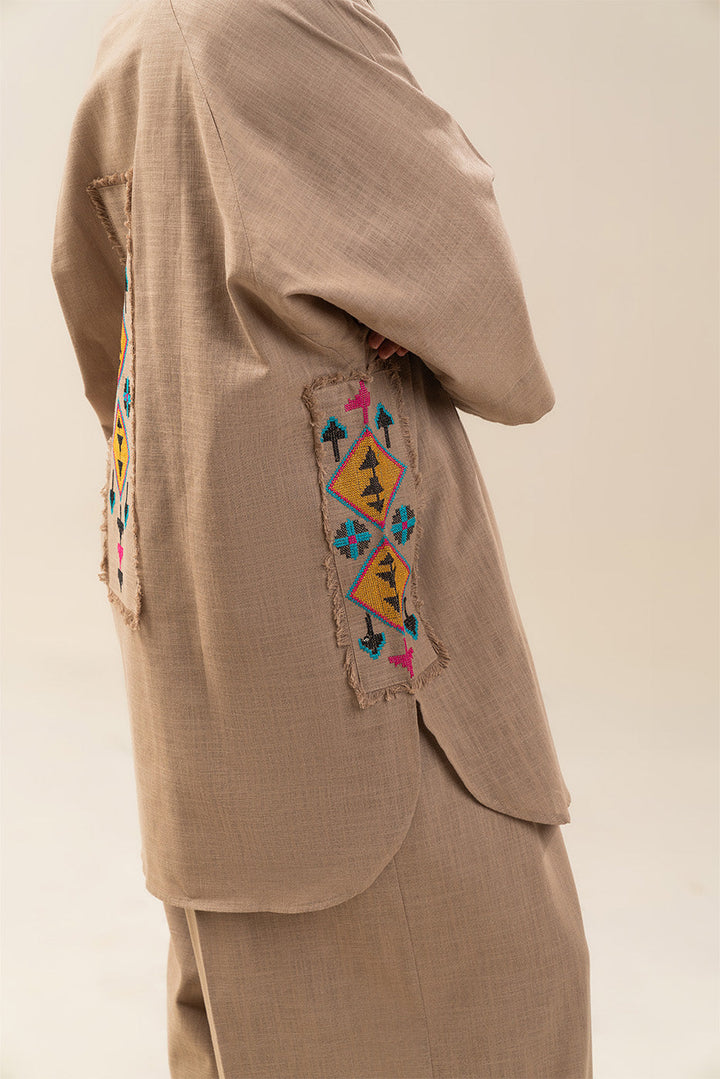- Description: Embroidered Shirt With Band Collar And Slit, Embroidery Motifs Patch On Front And Back With Frayed Edging Detail. Paired With Pleated Slack Pants To Complete The Look.