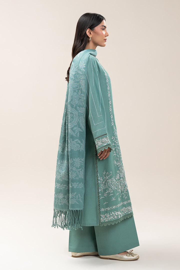 3 PIECE EMBROIDERED SLUB KHADDAR SUIT-MINT GLAM (UNSTITCHED)